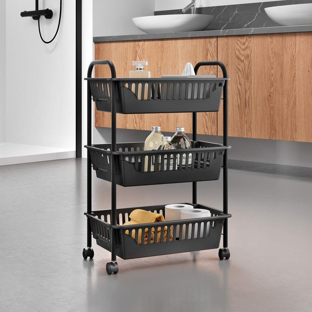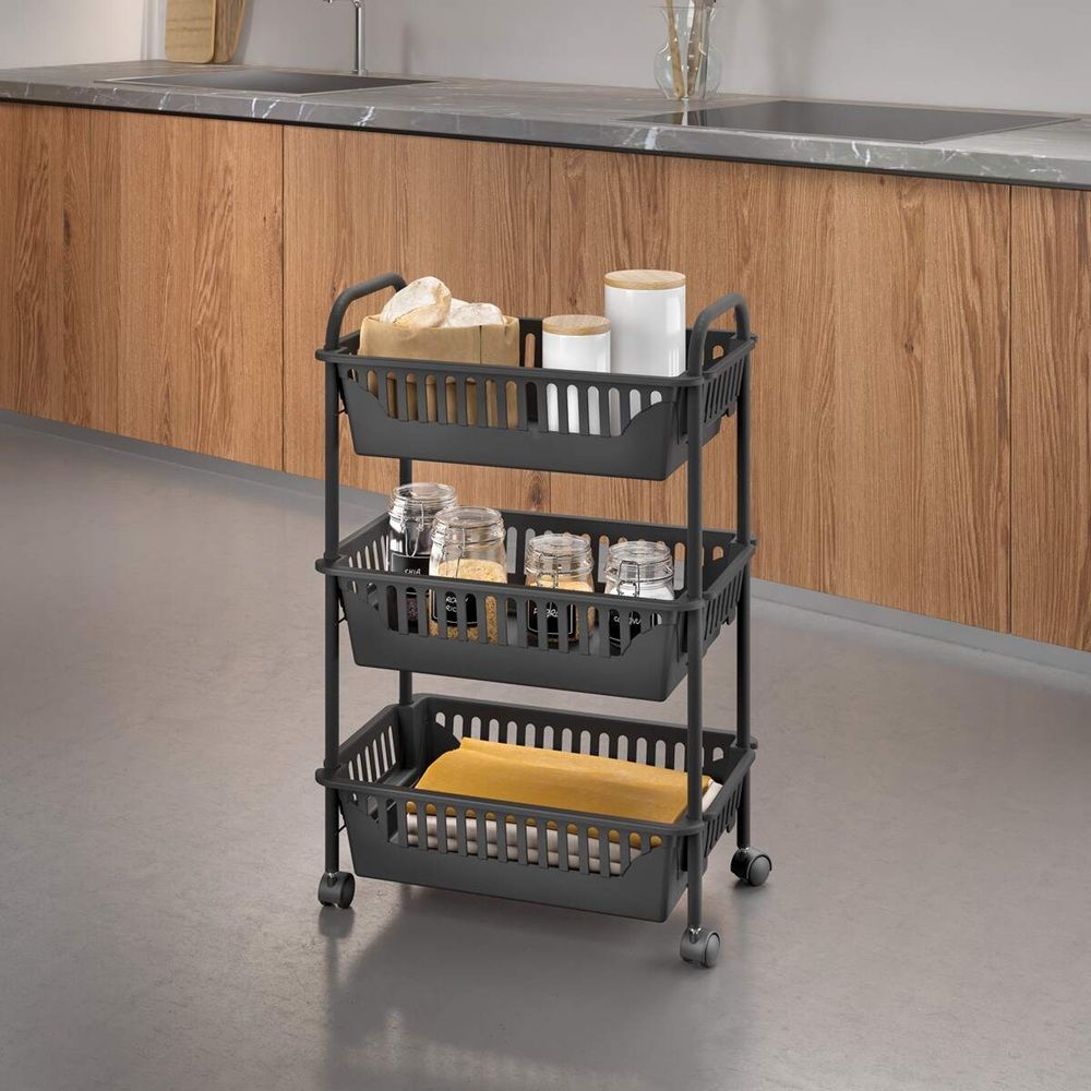 This versatile rolling cart features three spacious PP baskets for storing kitchen items, toiletries, cleaning supplies, or office essentials