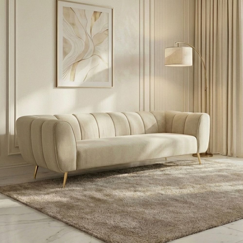 Its clean-lined silhouette and muted beige fabric upholstery offer a timeless aesthetic that complements every décor style.