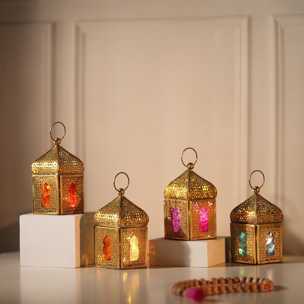 Mini Brass Antique Style Lanterns - Multi Color Glass (Set of 4)