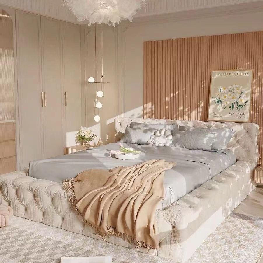 Minimalist Luxury Upholstered Bed Frame – Soft Tufted Platform Bed Design – Soft Velvet – Beige – King Size