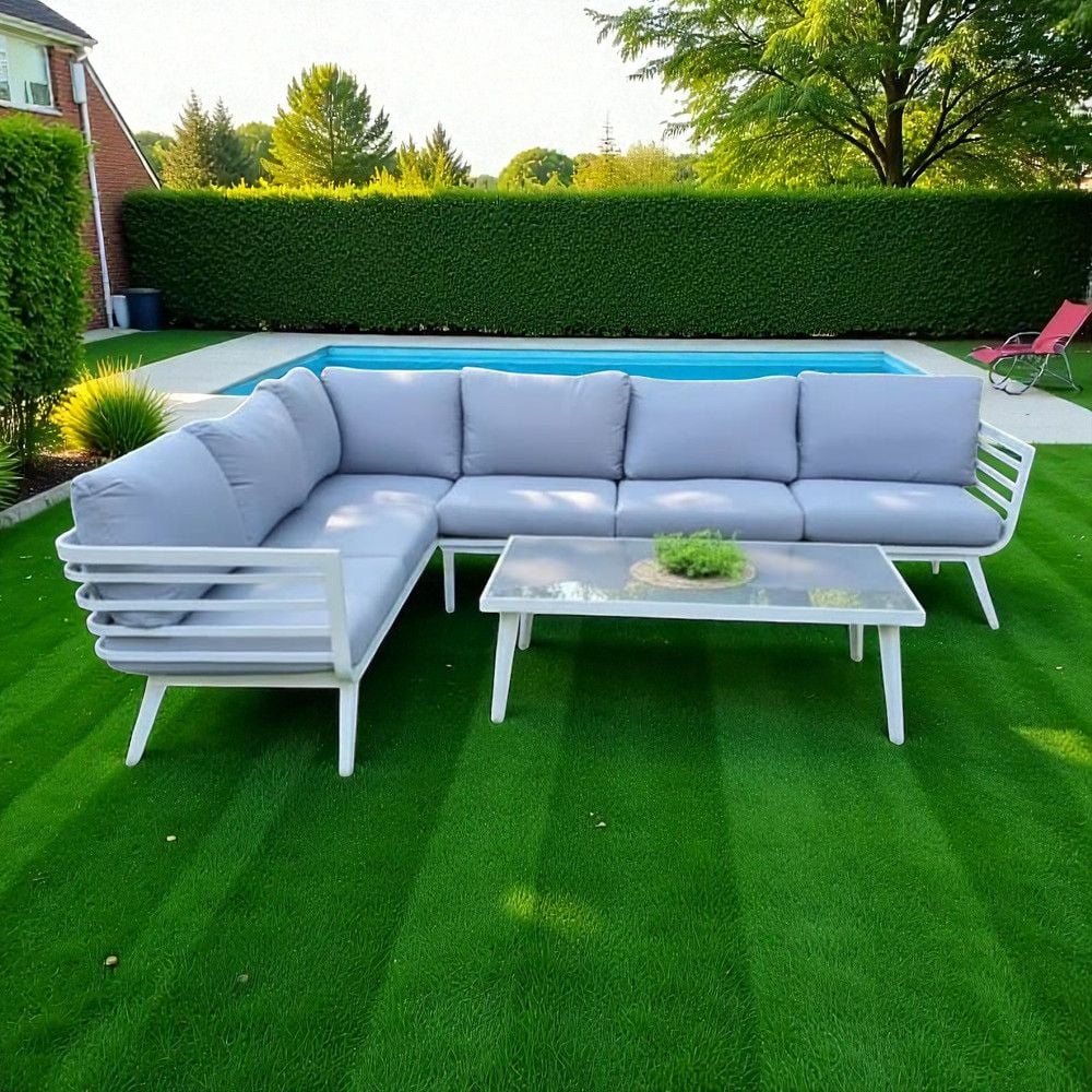 Modern Aluminium Outdoor Corner Sofa Set – White Frame with Grey Cushions