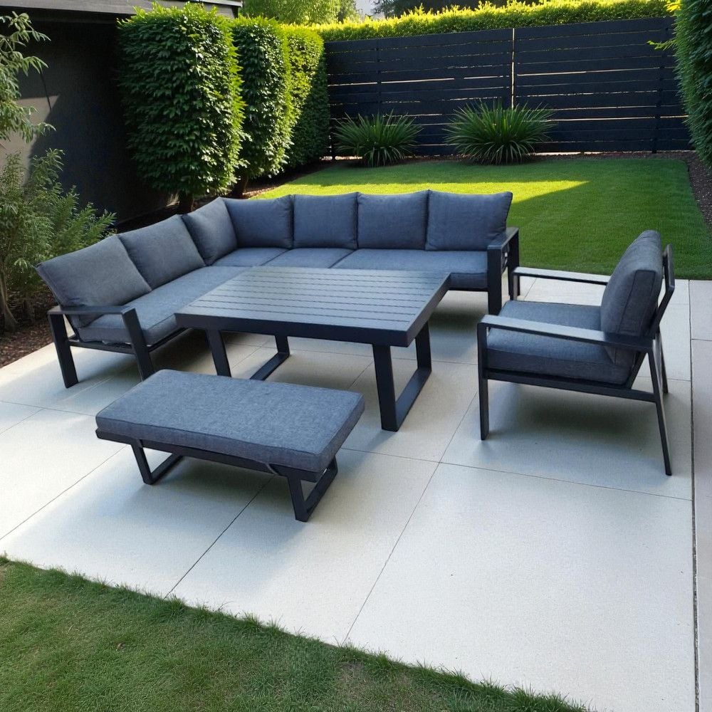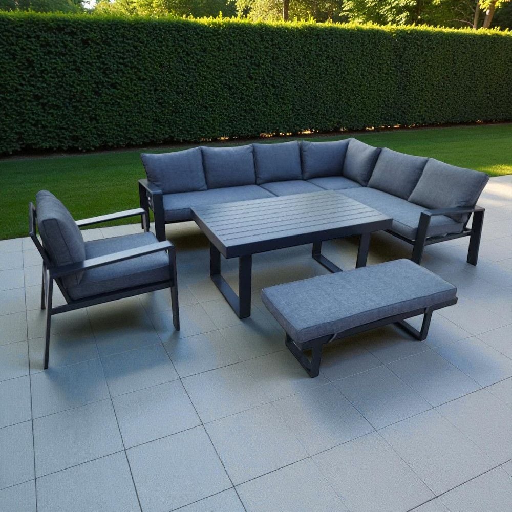 Modern Dark Grey Aluminium Outdoor Corner Sofa Set with Dining Table & Bench