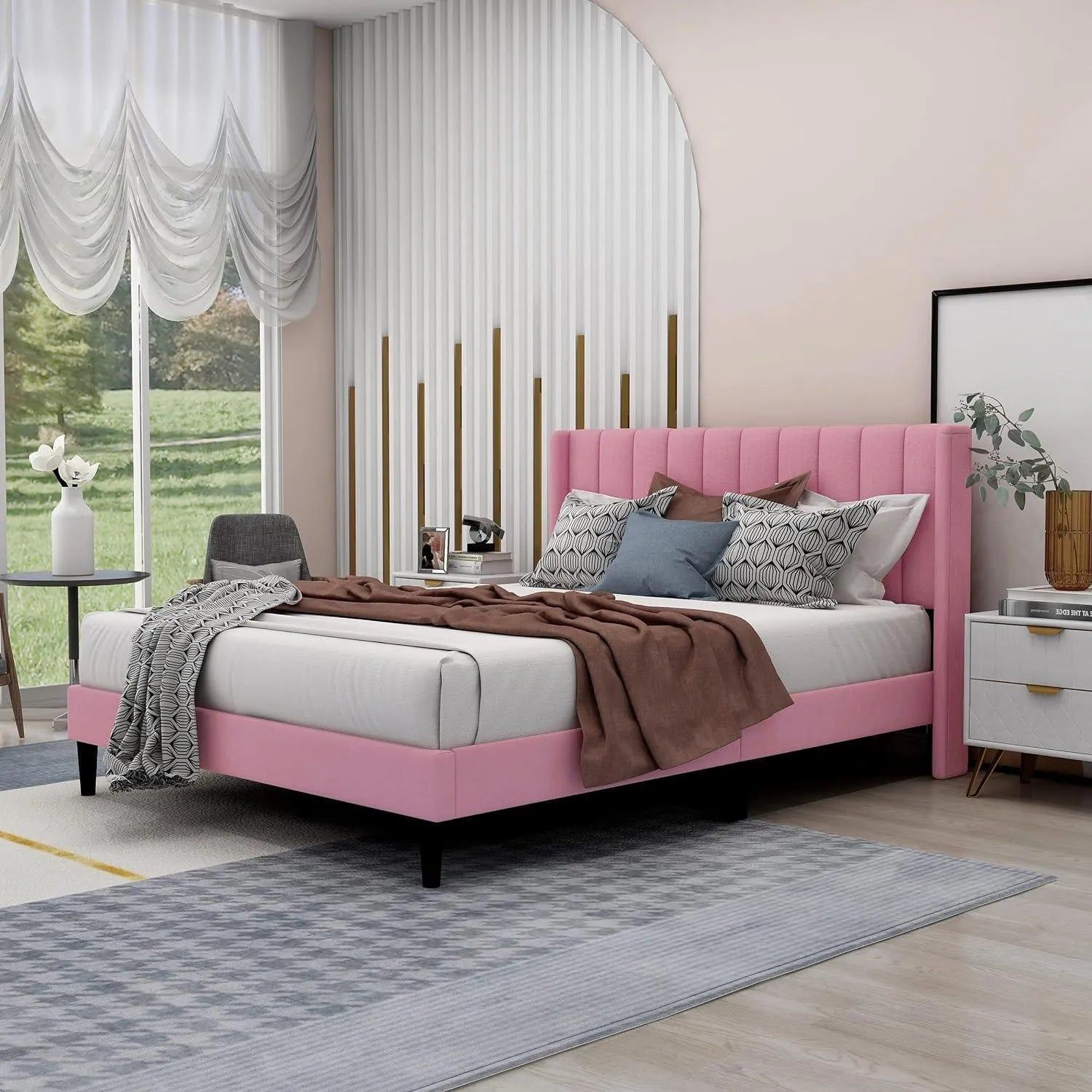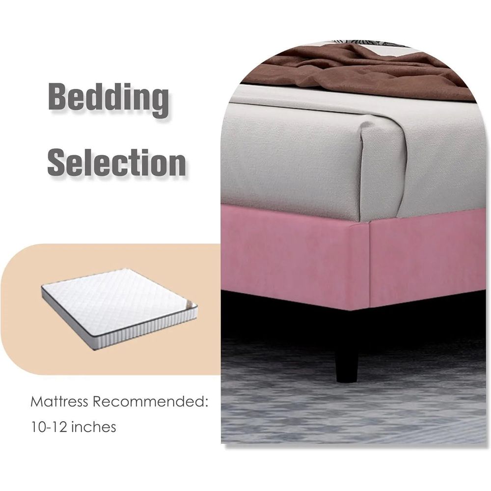 Modern Rectangular Velvet Upholstery Bed with Soft Wingback Headboard Pink (Super King)