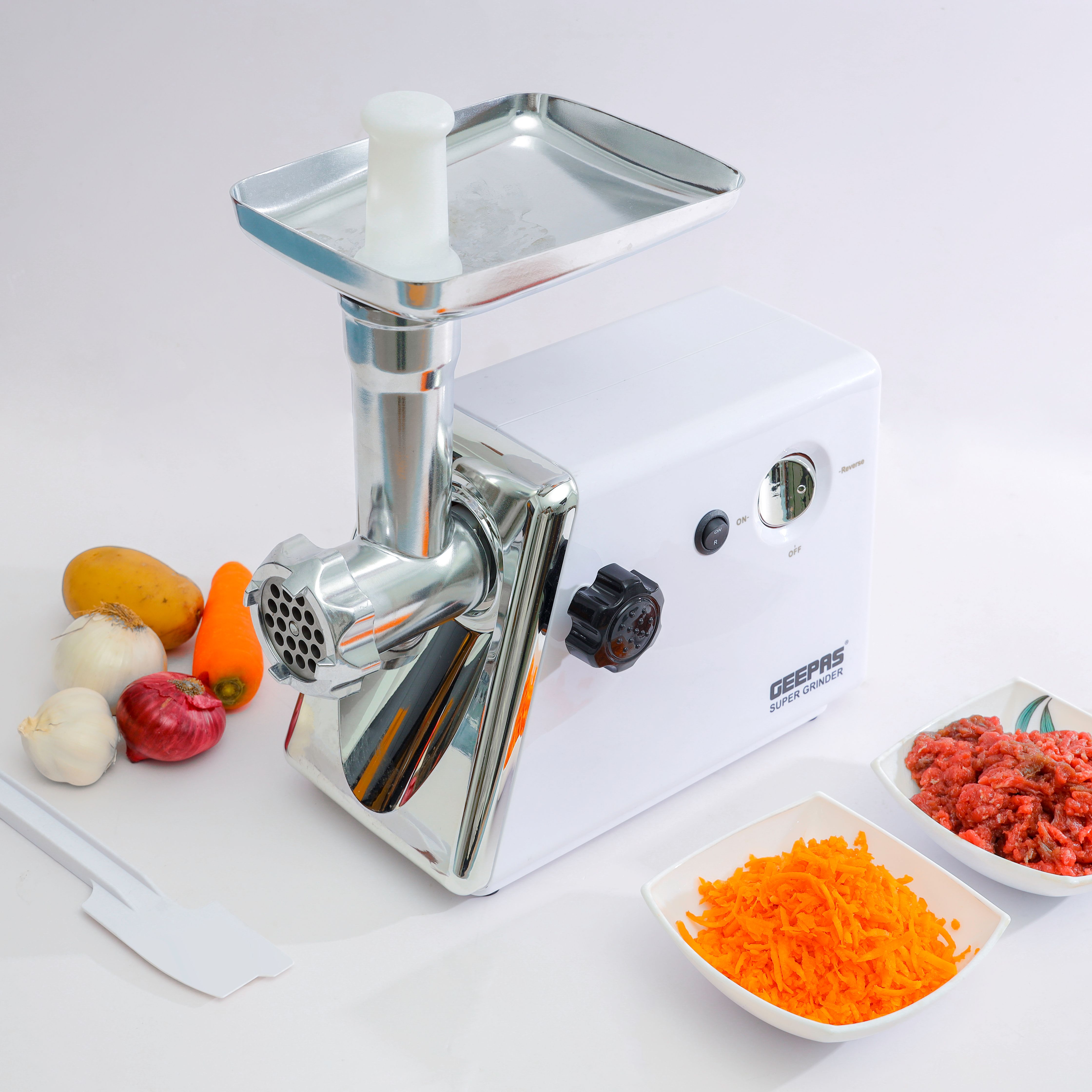 Geepas Multifunctional Powerful Meat Grinder with Reverse Function Meat Mincer Sausage Grinder 3 Metal Cutting Blade GMG765 White/Silver