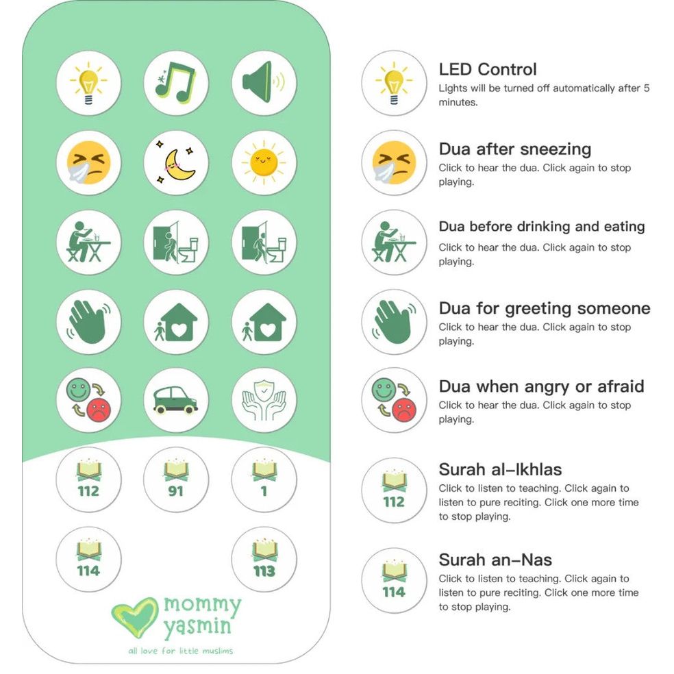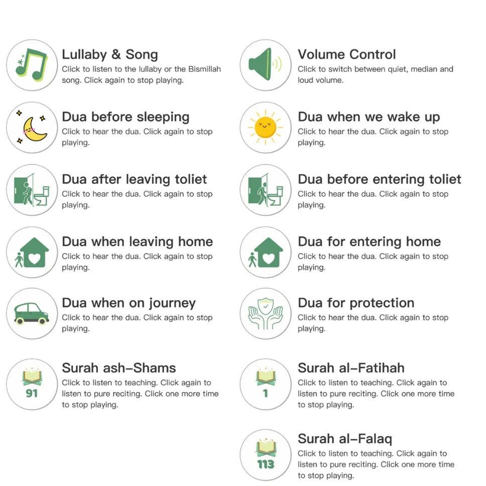 Educational and Spiritual Growth: Recites 5 Surahs and 14 Duas in both English and Arabic, helping children learn and connect with their faith.