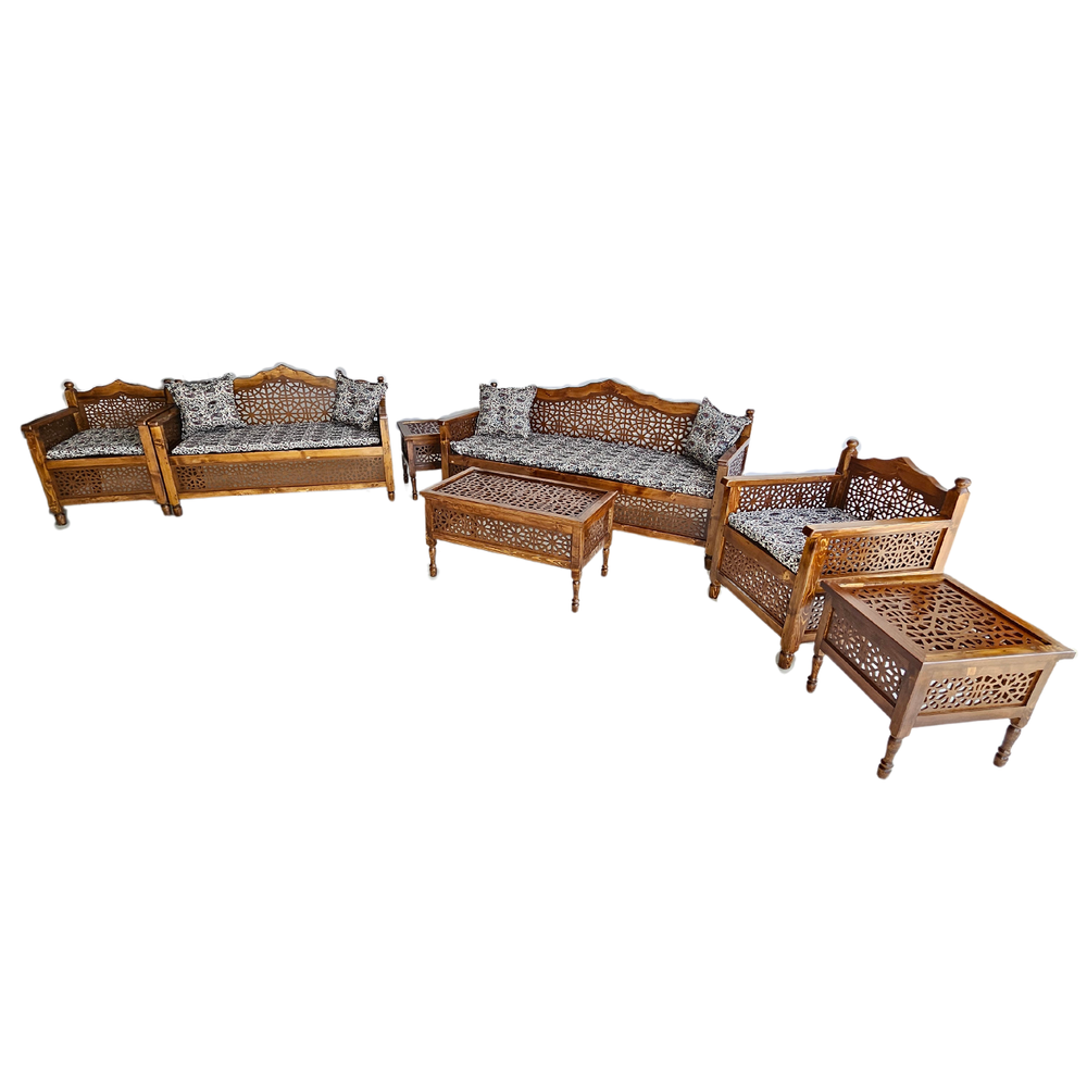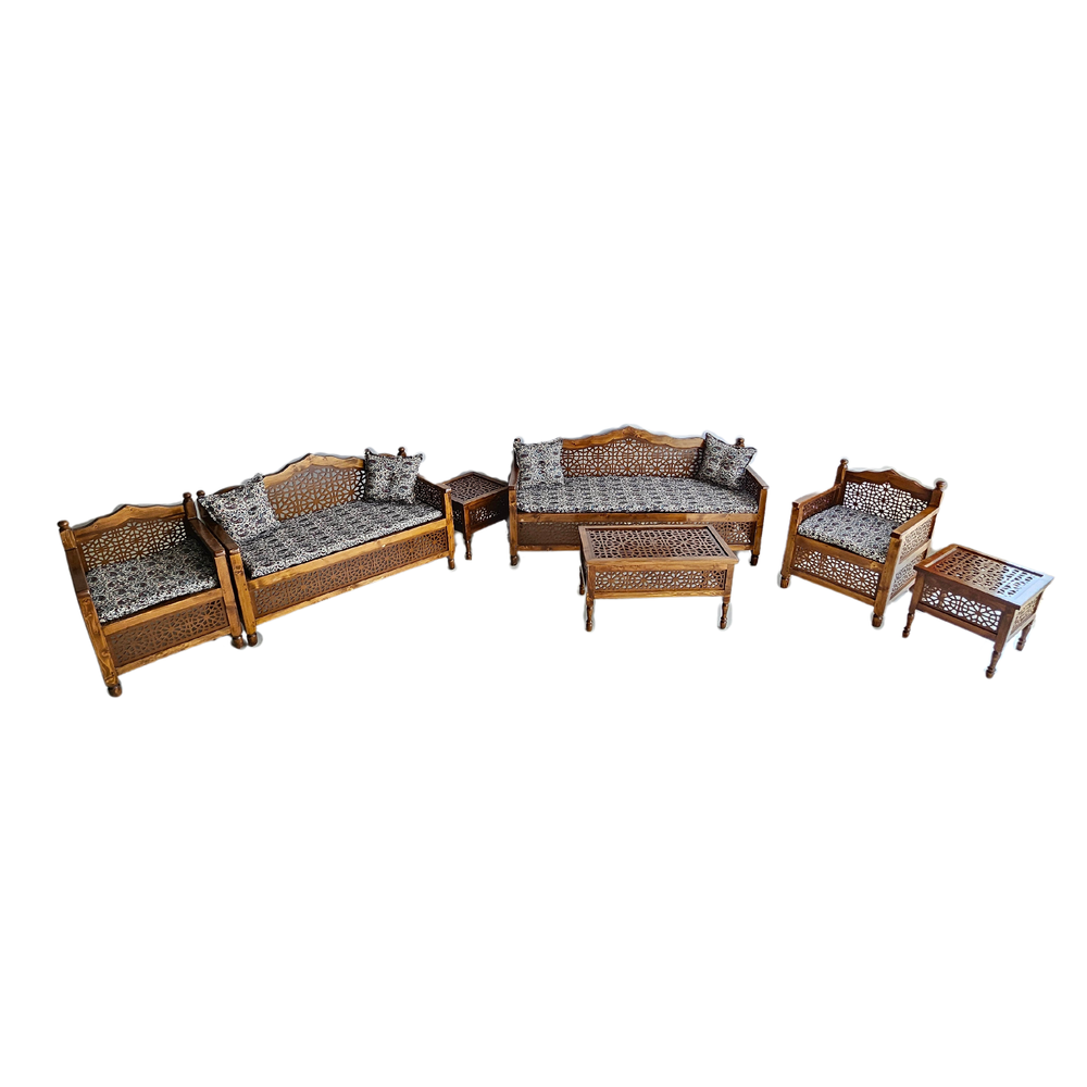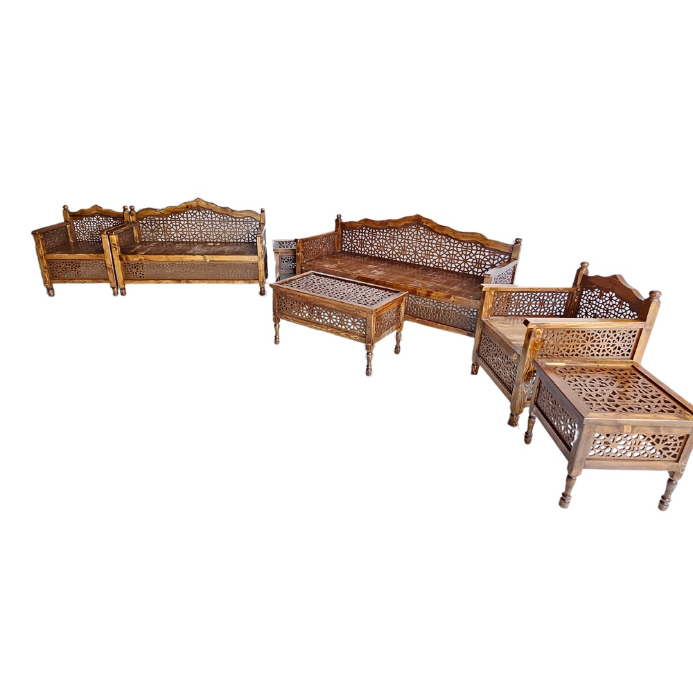 7-seater. premium pine wood set Intricately Carved Wooden Arabic Sofa Set, 6 Pieces. sutable for living room sofa. office and garden furniture