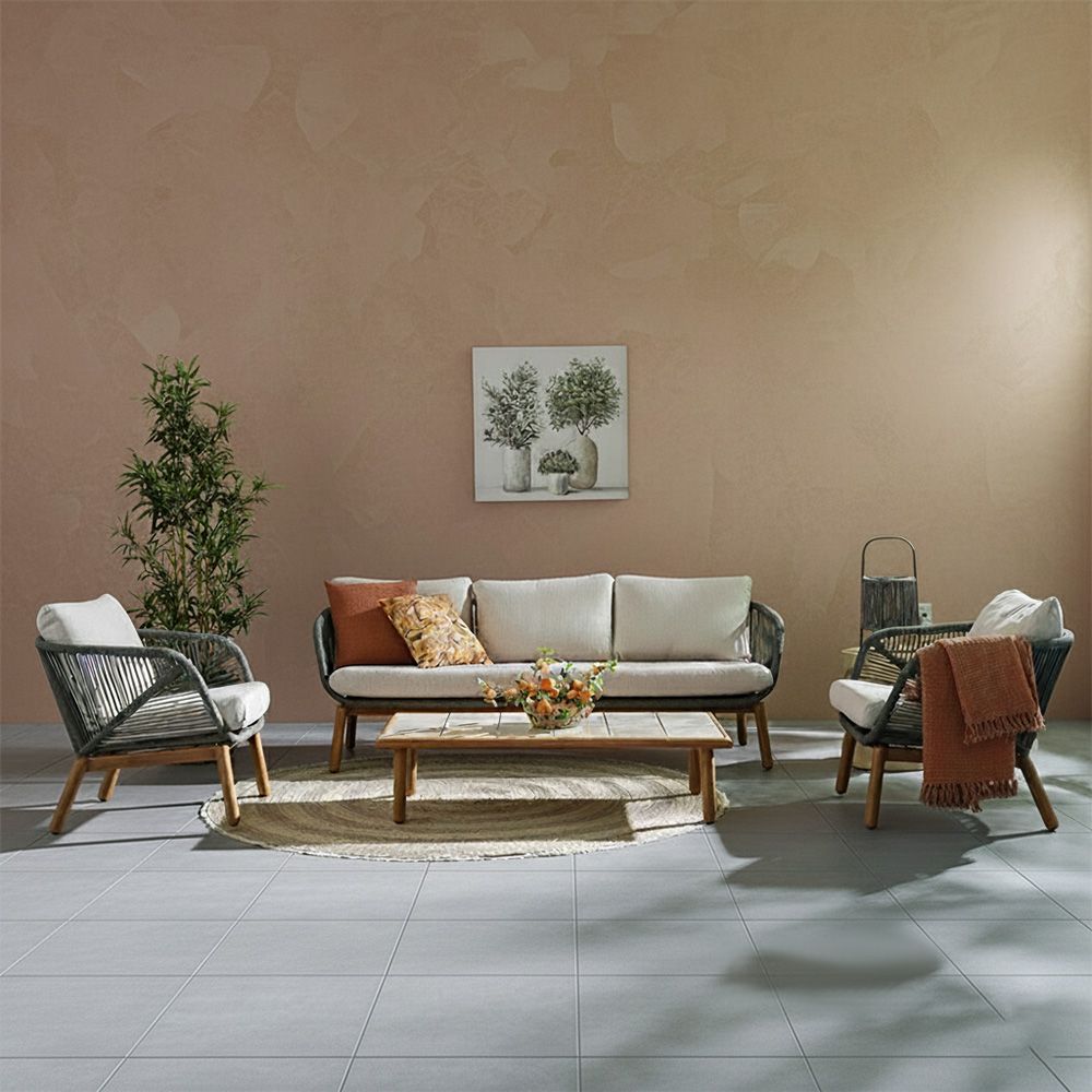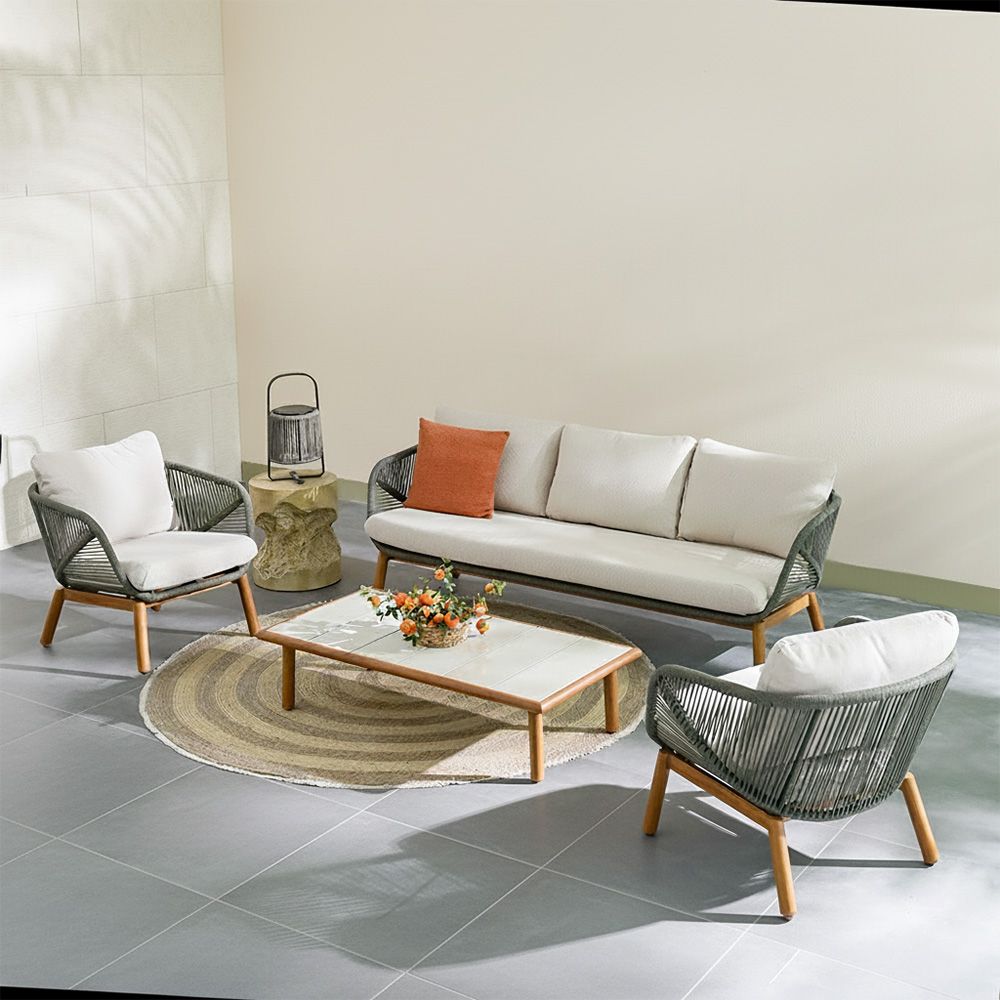 The sofa set is upholstered in Olefin fabric, known for its softness, UV resistance, and long-lasting performance.