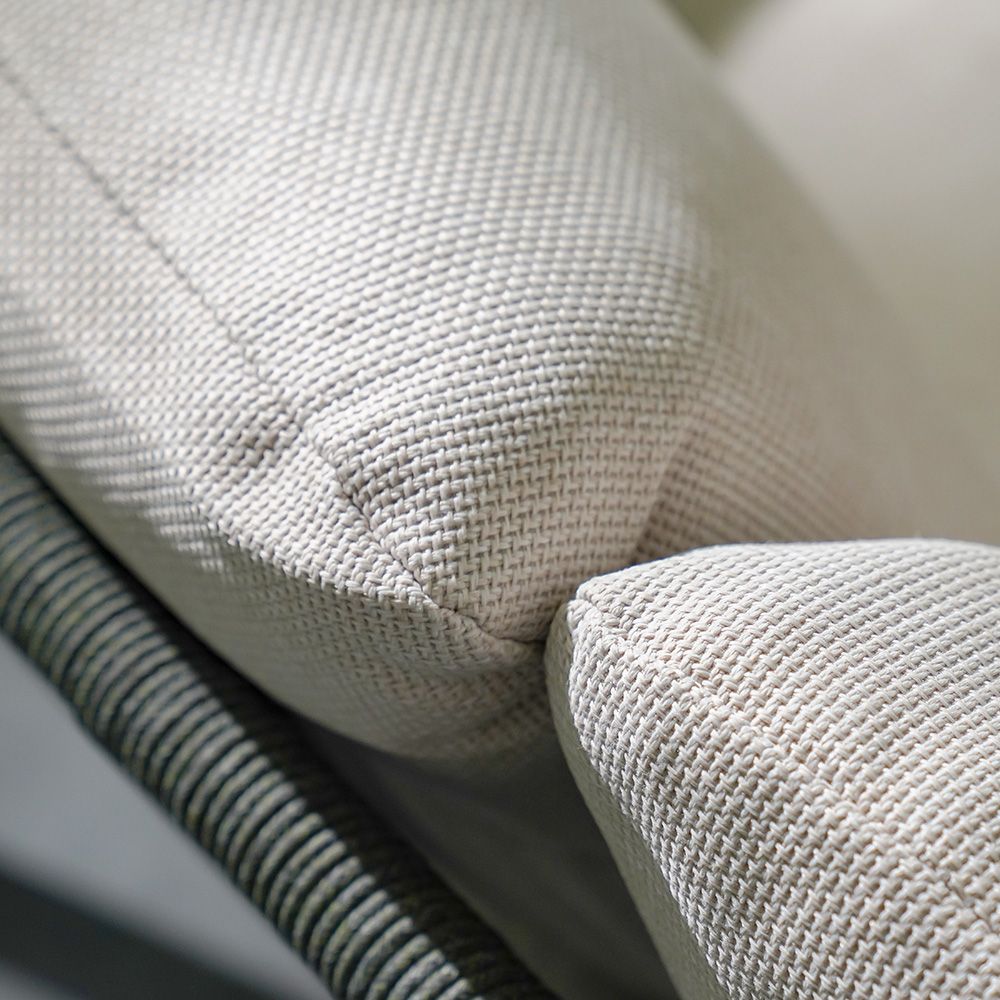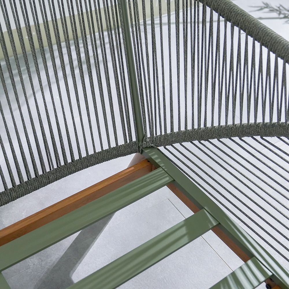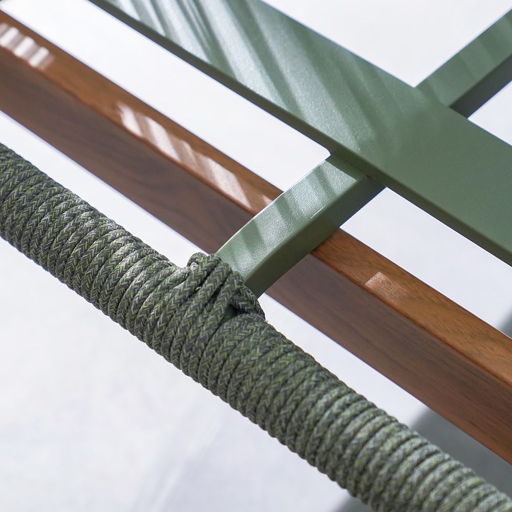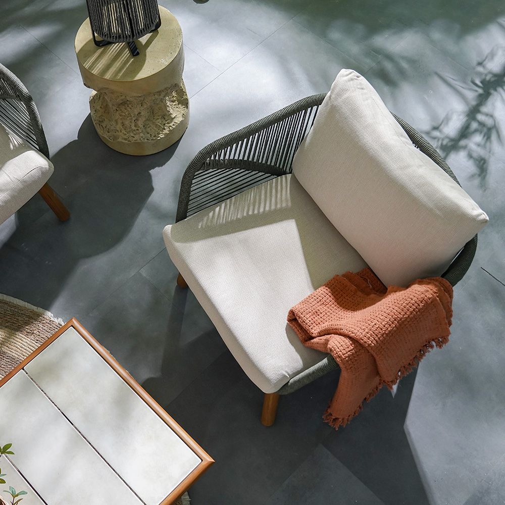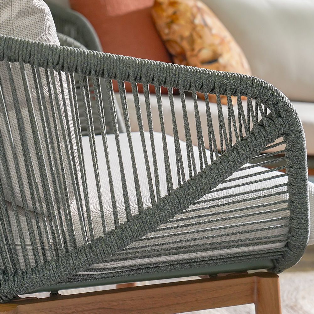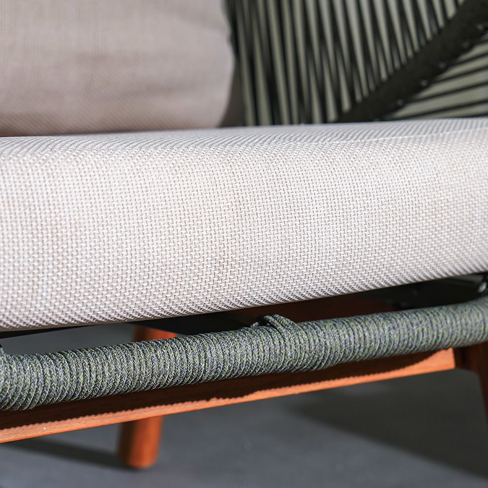 The beige cushion and grey-green rope detailing create a striking contrast for a refined look.