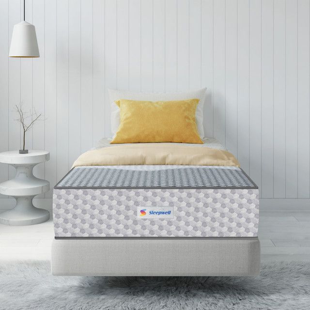 The product Ortho Pro Spring Split King Bed Size Impressions Memory Foam Mattress With Airvent Technology And 3-Zone Pocket Spring White -190x 100x 20 cm images have props used for illustrative purposes. Product Color may vary slightly due to photographic lighting or your screen settings.