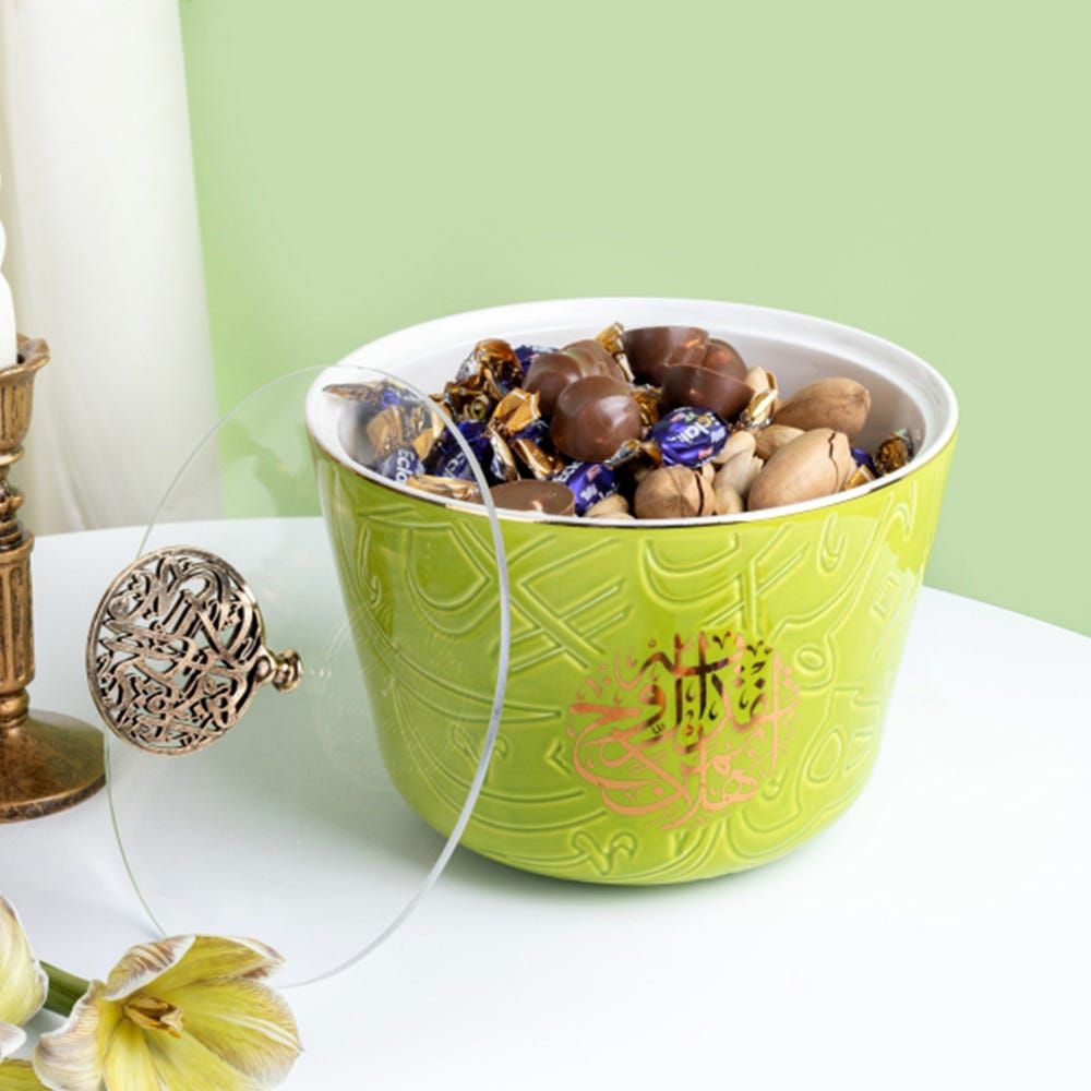 - A luxurious glass jar with a cover from the Zuwar collection, for storing and serving chocolate or nuts, or even to present it as a gift for your loved ones.