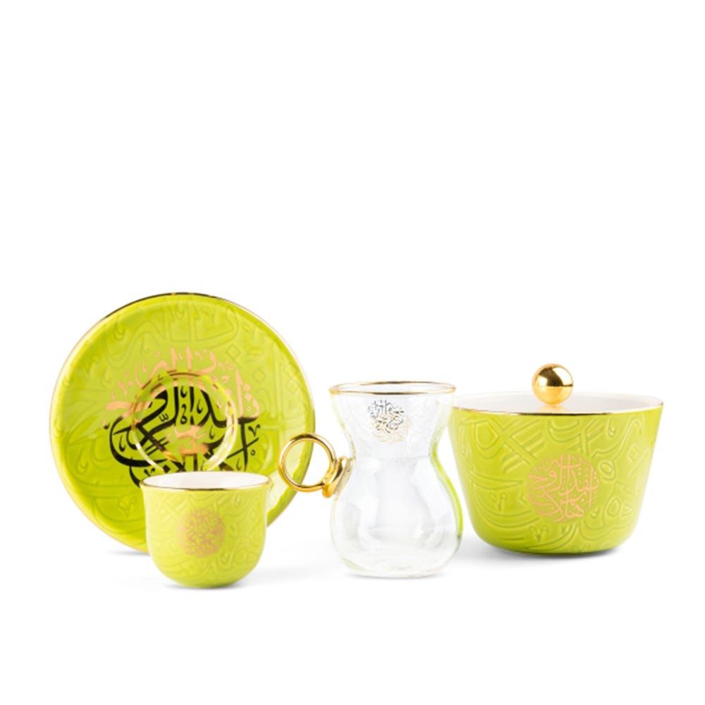 Otantik Zuwar Set Of 6 Glass Cup, 6 Saucers, 6 Cawa Cup And Suger Bowl 150Cc Green