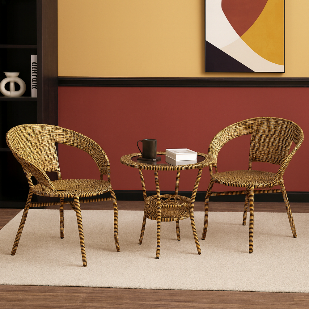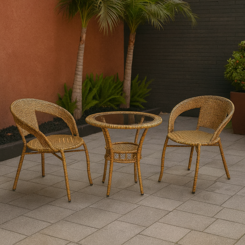 Includes a modern glass-top table and two ergonomic wicker chairs