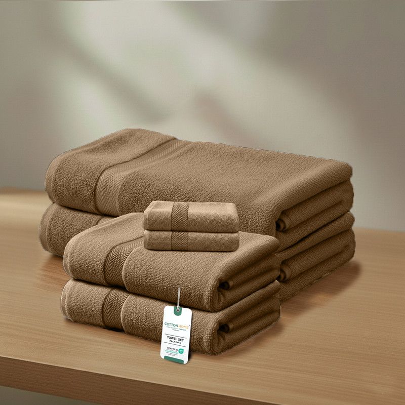 Premium Cotton Towel Set 6-Piece Towel Set Includes 2pc Face Towel 30x30cm,2pc Hand Towel 40x70cm, 2pc Bath Towel 70x140cm , 600 GSM Quick Dry and Durable , Brown