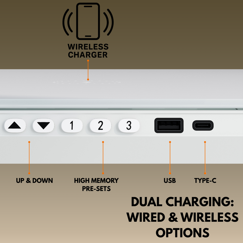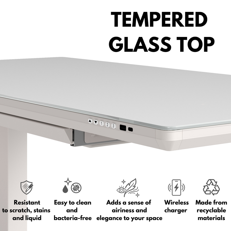 Wireless Charging: Keep devices powered up with a built-in wireless charging pad on the tempered glass tabletop