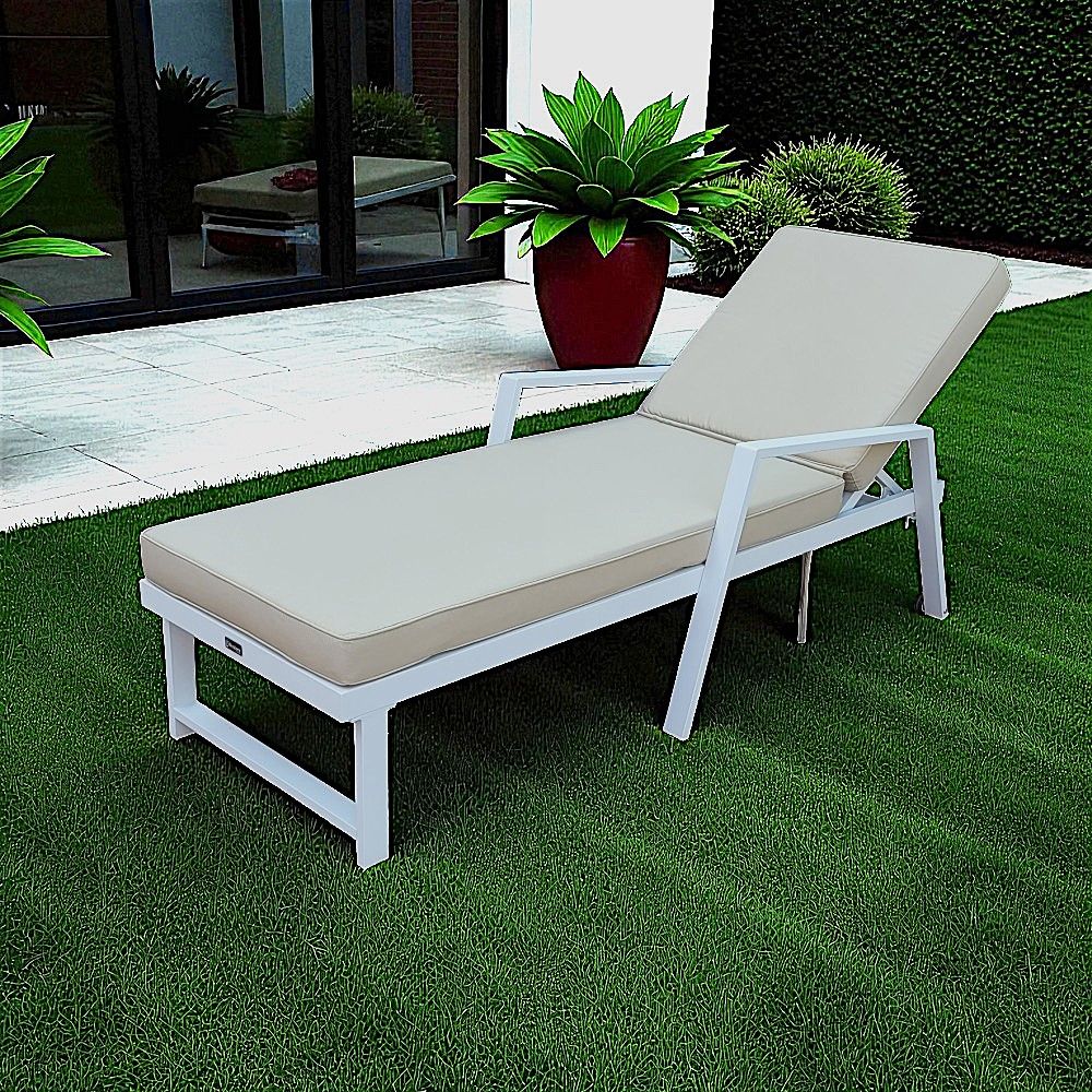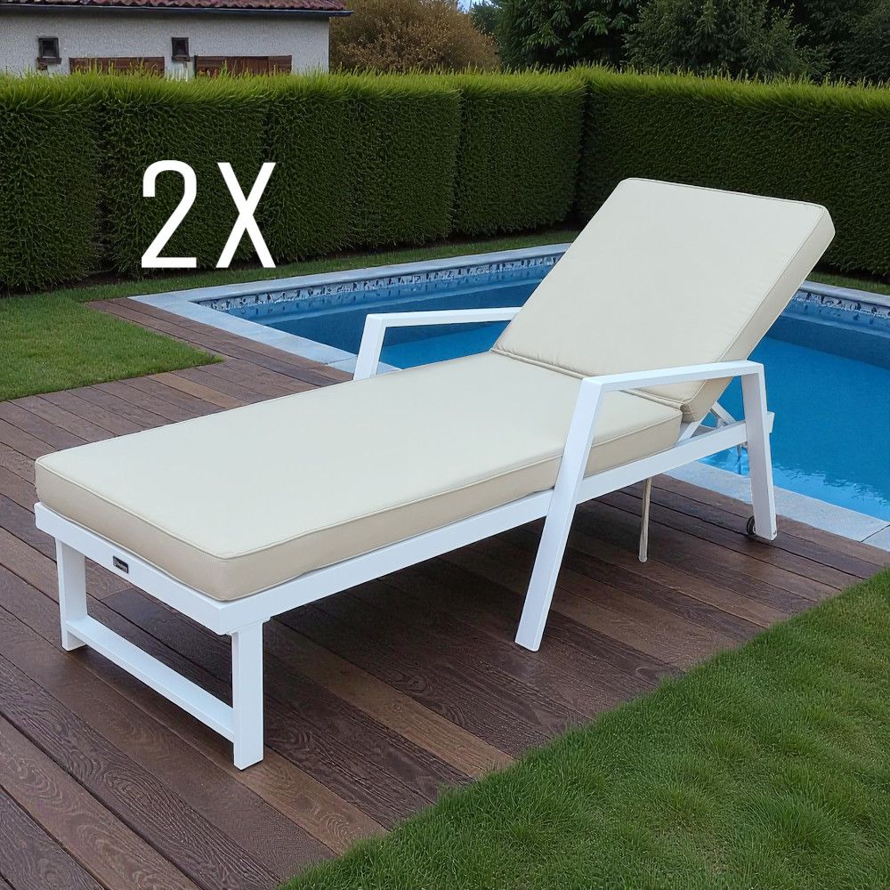 Premium White Aluminium Outdoor Sun Lounger with Adjustable Backrest – Beige Cushions , 2x Sunbeds
