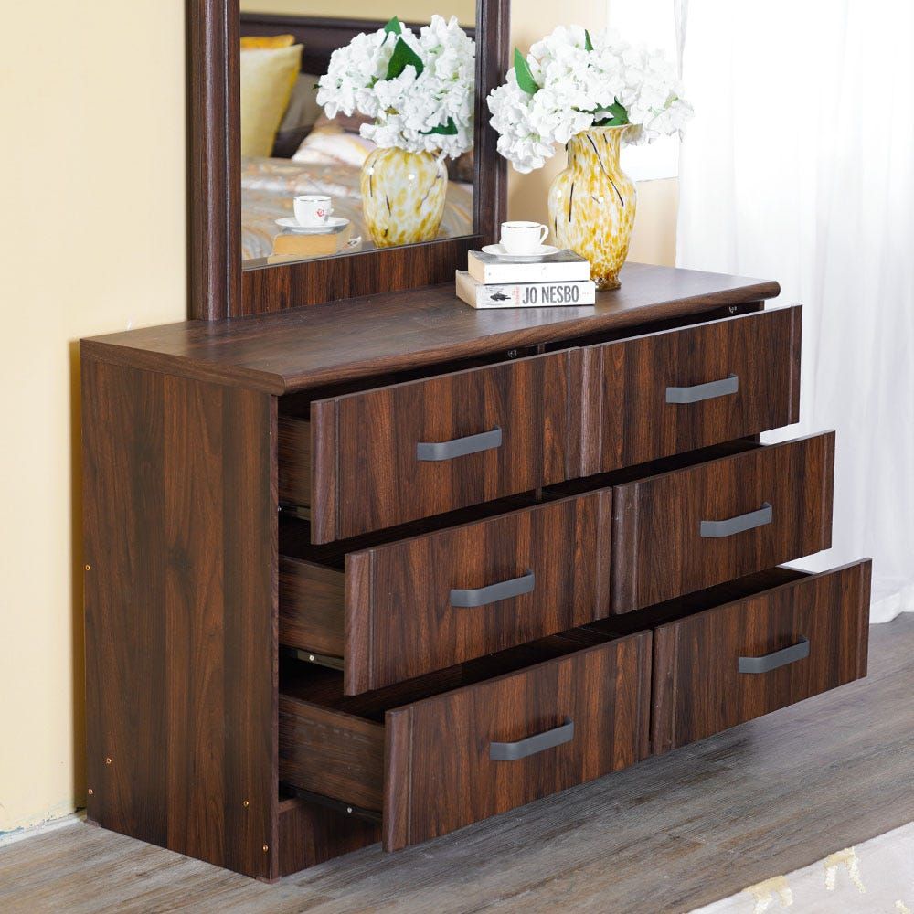 Dresser has a 6 drawer storage system with soft closing mechanism and comes with the mirror.