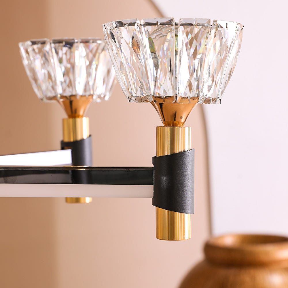 Want to add an instant shine of gold to your space? Well, the Saira fancy wall bracket chandelier can help you with that, made from metal and glass the chandelier is strong and durable. The chandelier is equipped with a 3 in 1 LED bulb that lights up in 3 different light intensities ranging from low to medium to high. The 6 LED bulbs are placed in a wonderfully crafted glass holder, the black and gold combination on the bottom of the holder makes the chandelier an aesthetic piece of decor.