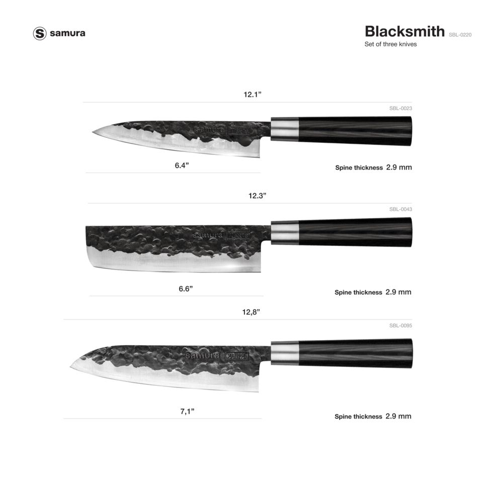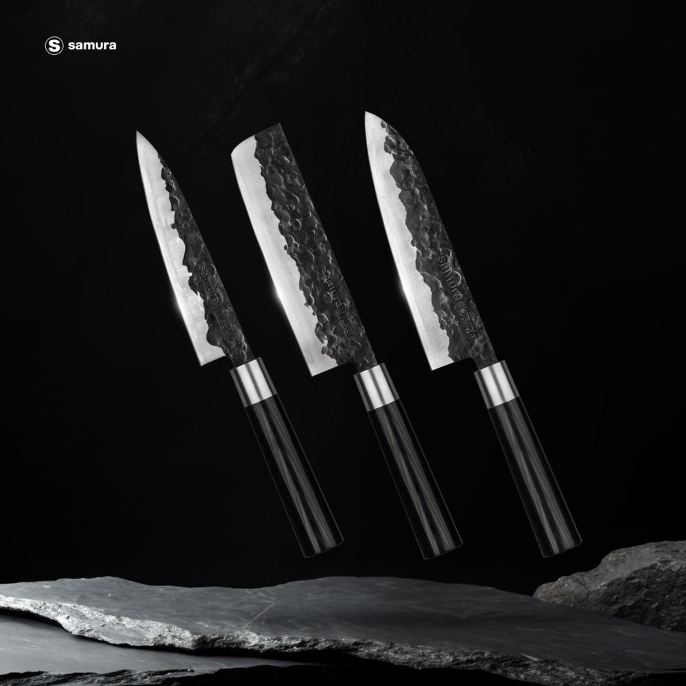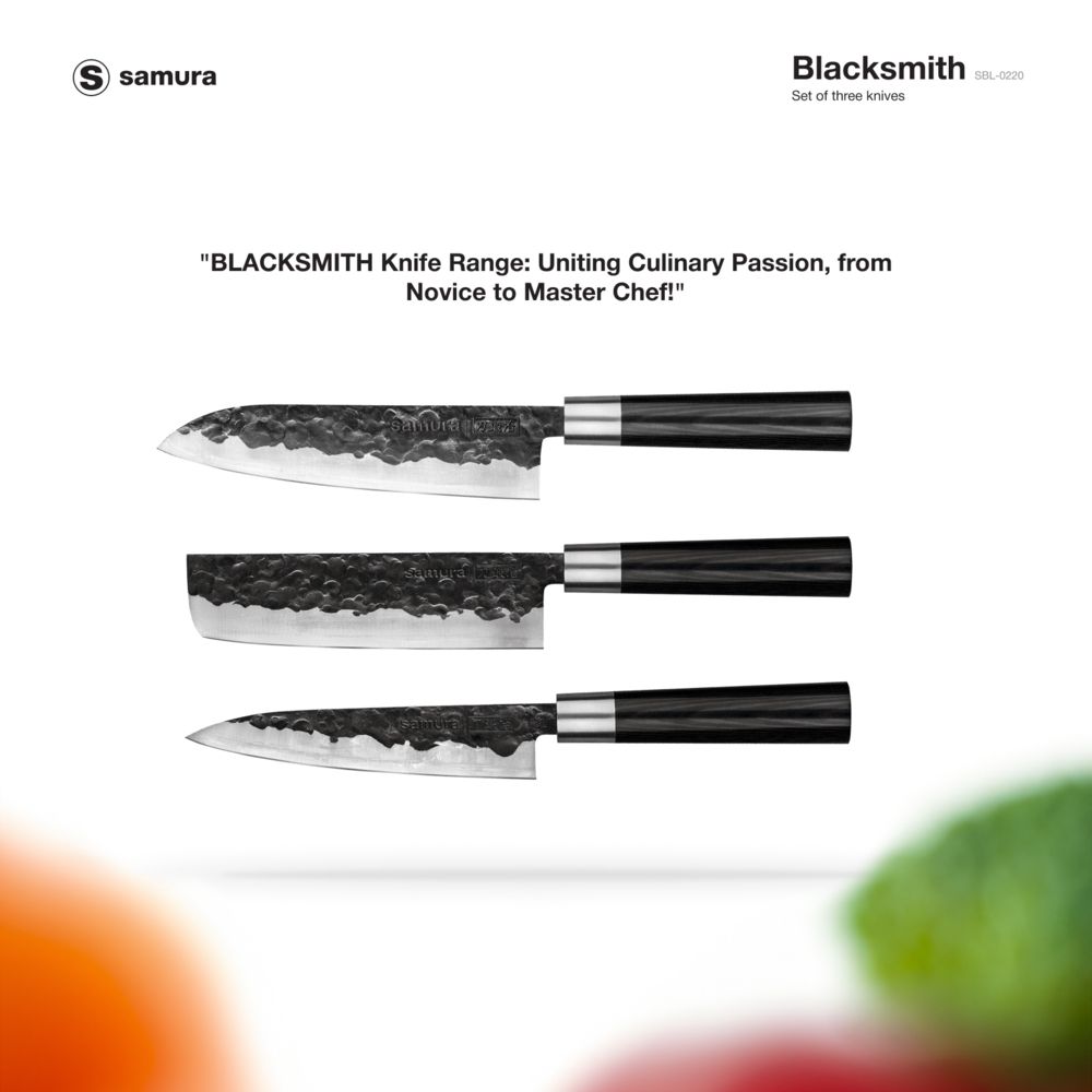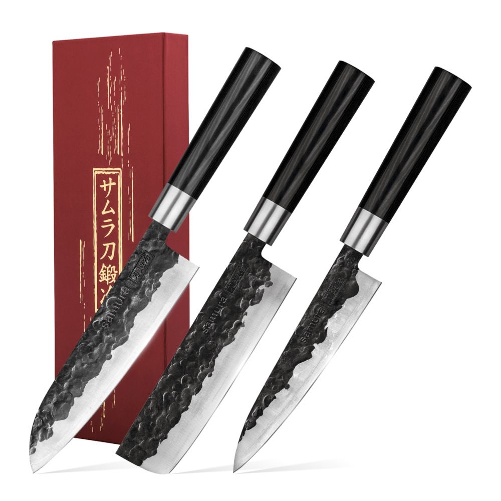 Samura Blacksmith Set Of 3 Kitchen Knives: Utility Knife, Nakiri Knife, Santoku Knife