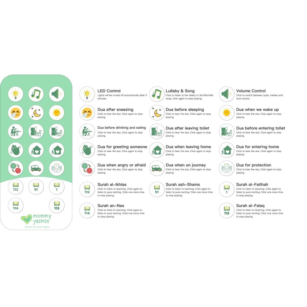 Interactive and Educational: Features easy-to-use remote control for adjusting recitations and lullabies, offering an interactive and intuitive experience for both kids and parents.
