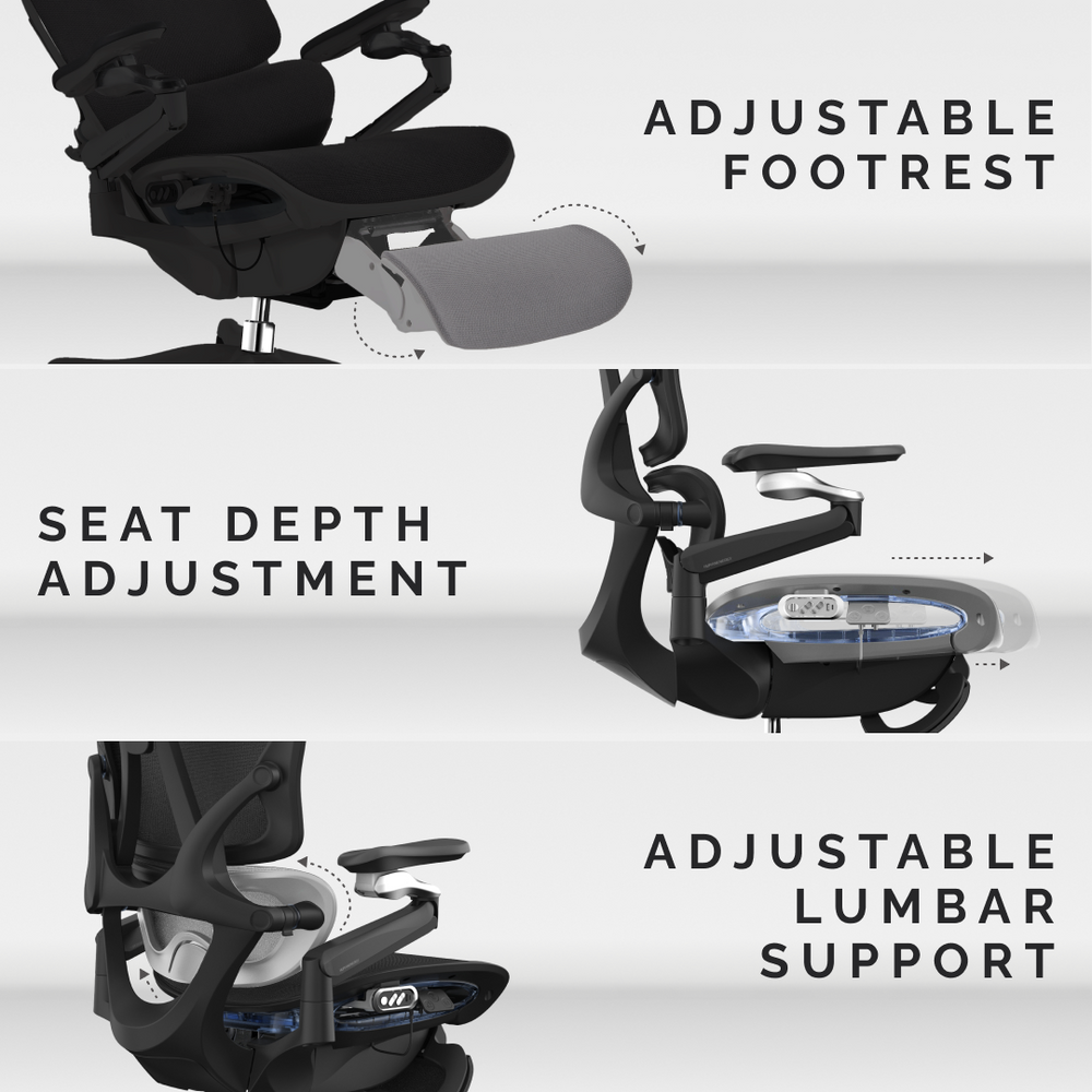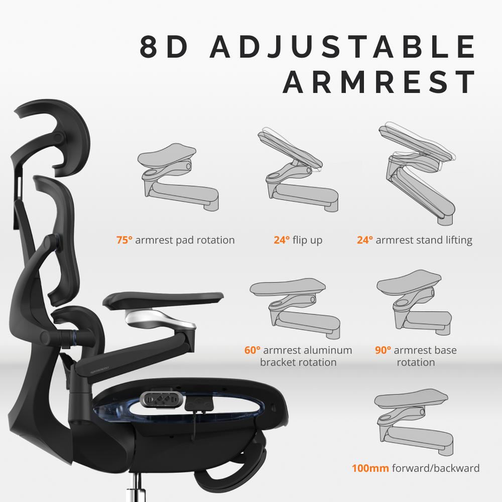 Featuring 8D adjustable armrests for full arm positioning, a 3D adjustable headrest for neck alignment, and adjustable lumbar support for healthy posture, this chair adapts to your body with ease