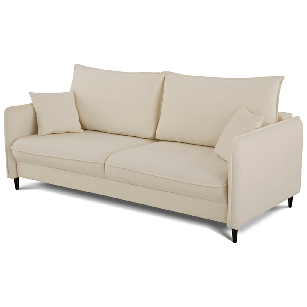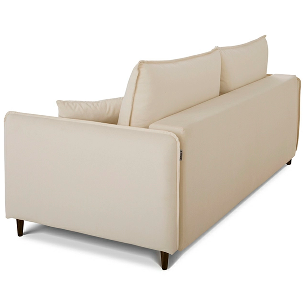 Sofa bed «Fjord» combines functionality and a laconic look. It has all the basic elements of the scandinavian style: narrow armrests and soft cushions with a fashionable «French seam», a pair of additional miniature pillows for interior decoration, and decorative folds in the places where the armrest and seat are rounded.