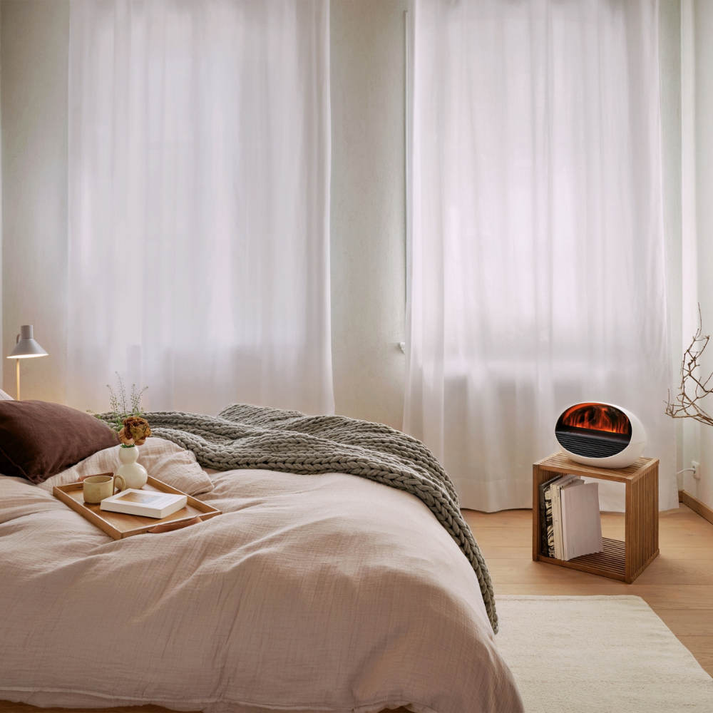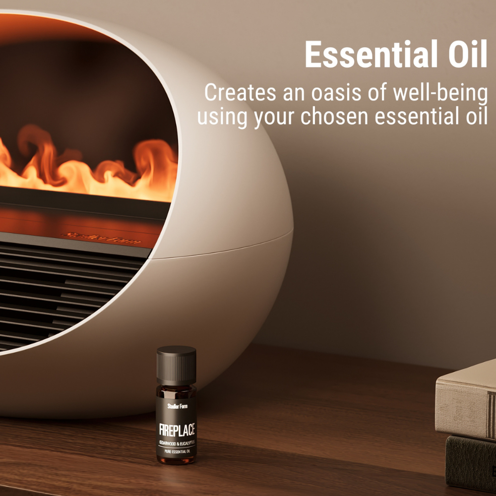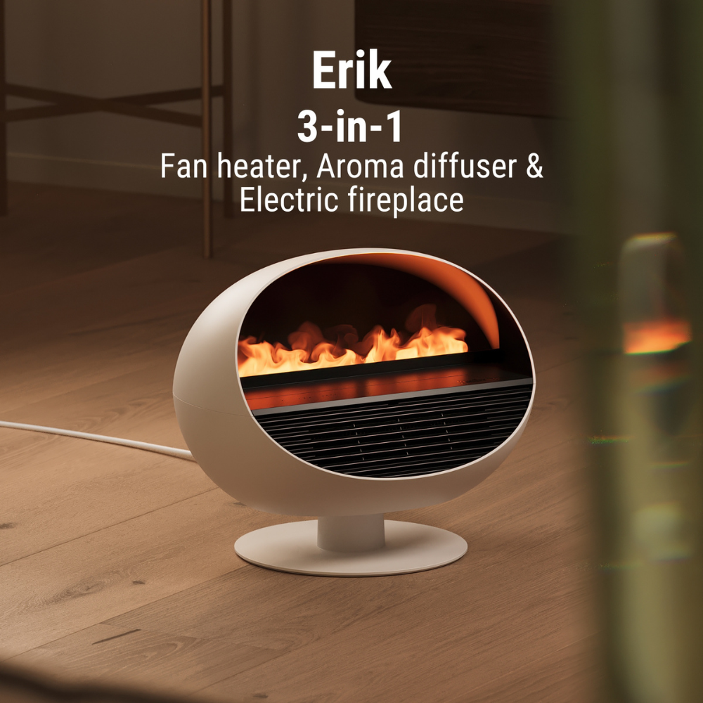 Erik brings the atmosphere of fireplace into any room – an impressive combination of fan heater, electric fireplace and aroma diffuser.