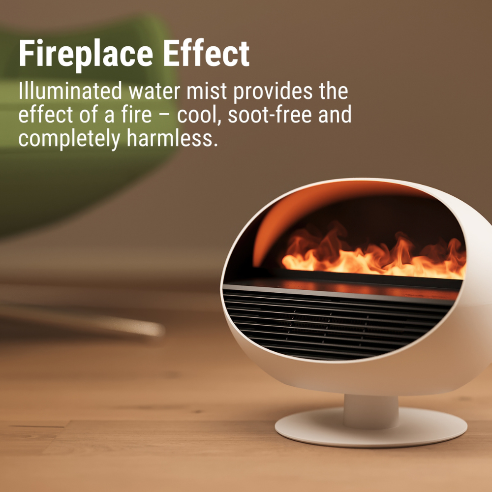 Fireplace atmosphere: with the illuminated water mist, Erik creates a realistic effect fire; if the fan heater function is activated, Erik provides a cosy fireplace atmosphere with the outflowing heat