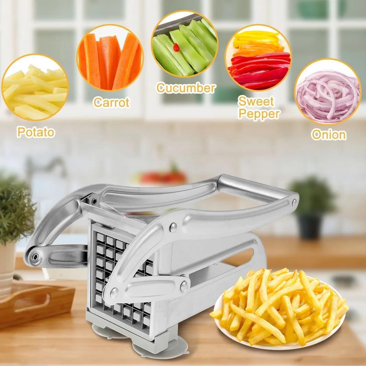 Stainless Steel Multi-Function Kitchen Gadget - Fruit & Vegetable Slicer, French Fry Cutter, Potato and Onion Chopper