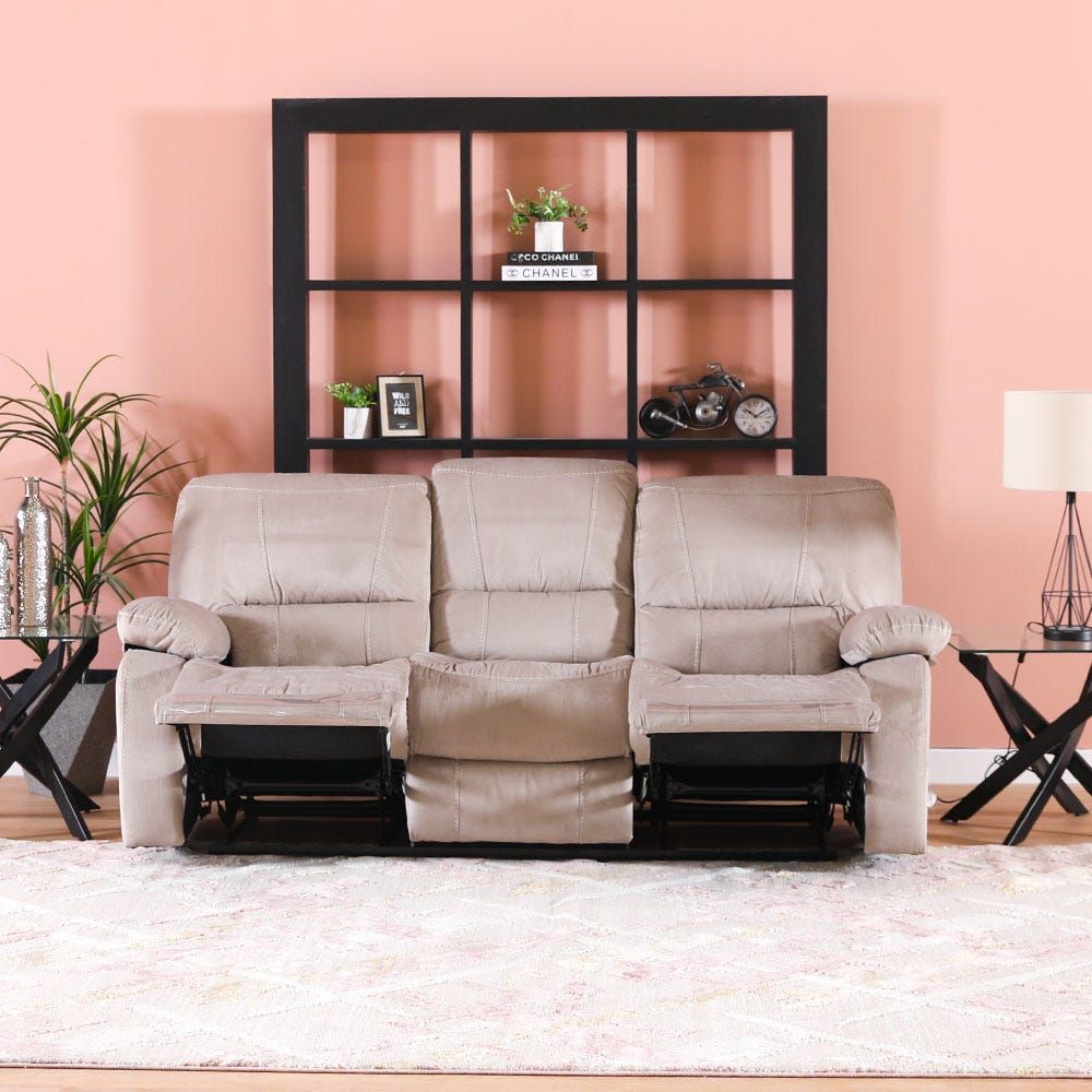 The product Stallion 3+2 Fabric Motion Recliner with Console Set -Plush Beige images have props used for illustrative purposes. Product Color may vary slightly due to photographic lighting or your screen settings.