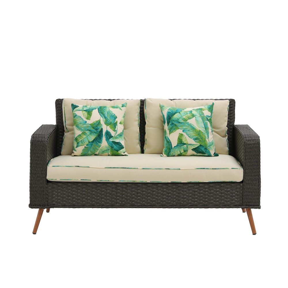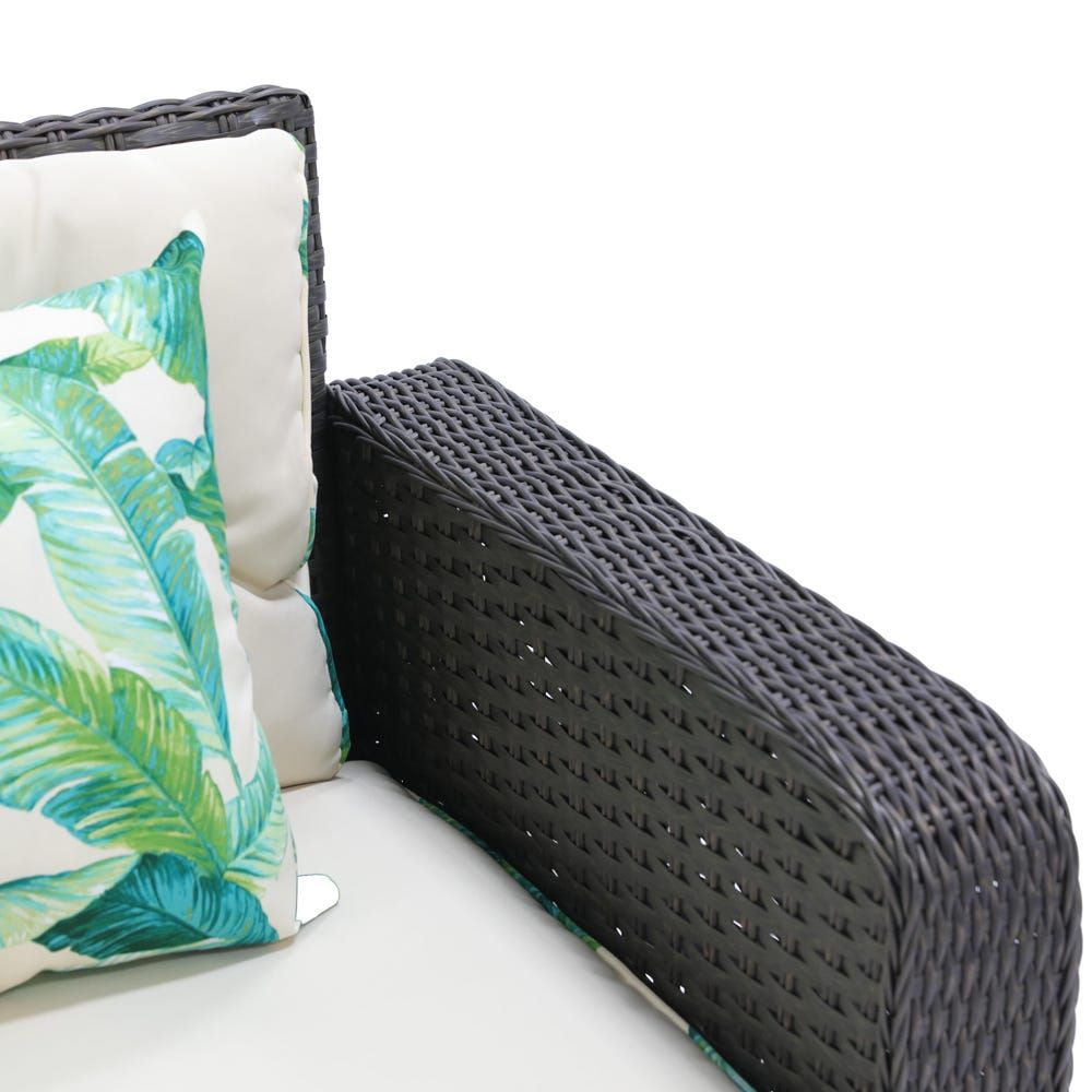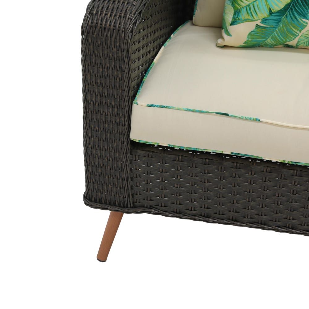 Add some tropical charm to your outdoor area with the gorgeous Stella two seater that features subtle cream colored fabric upholstered cushioned seating and backrest with tropical print throw pillows that make the couch absolutely picture-perfect. We also love the rattan weaved frame that is sure to look amazing in any outdoor space.