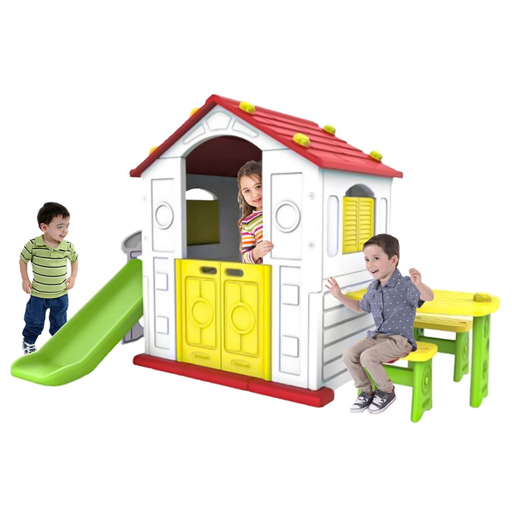 Kid's will never run out of things to do with this activity packed playhouse By MYTS featuring a table, slide and basketball hoop!