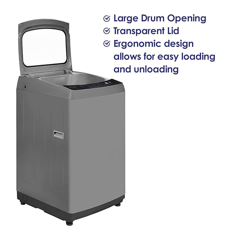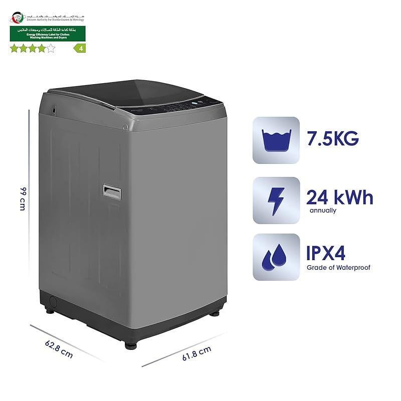 Technical Specifications: Compact, efficient, and Energy-saving Clothes Washing Machine in Silver. Loading Capacity: 7.5kg. ESMA 4 Star Rating. Net Weight: 38 kg. Dimensions: 61.8 x 62.8 x 99 (WxDxH) cm. Compact in size, optimal for bathroom, kitchen, utility room. With Child-Lock, Delay-Start, Power-Off Memory, and transparent Lid. Grade of Waterproof: IPX4. With a large Drum Opening of 38 x 29 cm (WxD) for easy and quick loading and unloading. Ergonomic Lid ensures one-hand operation.