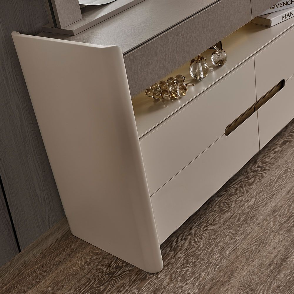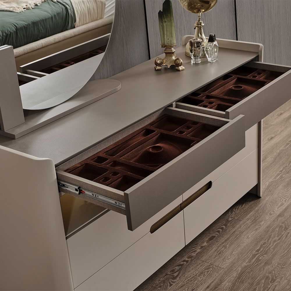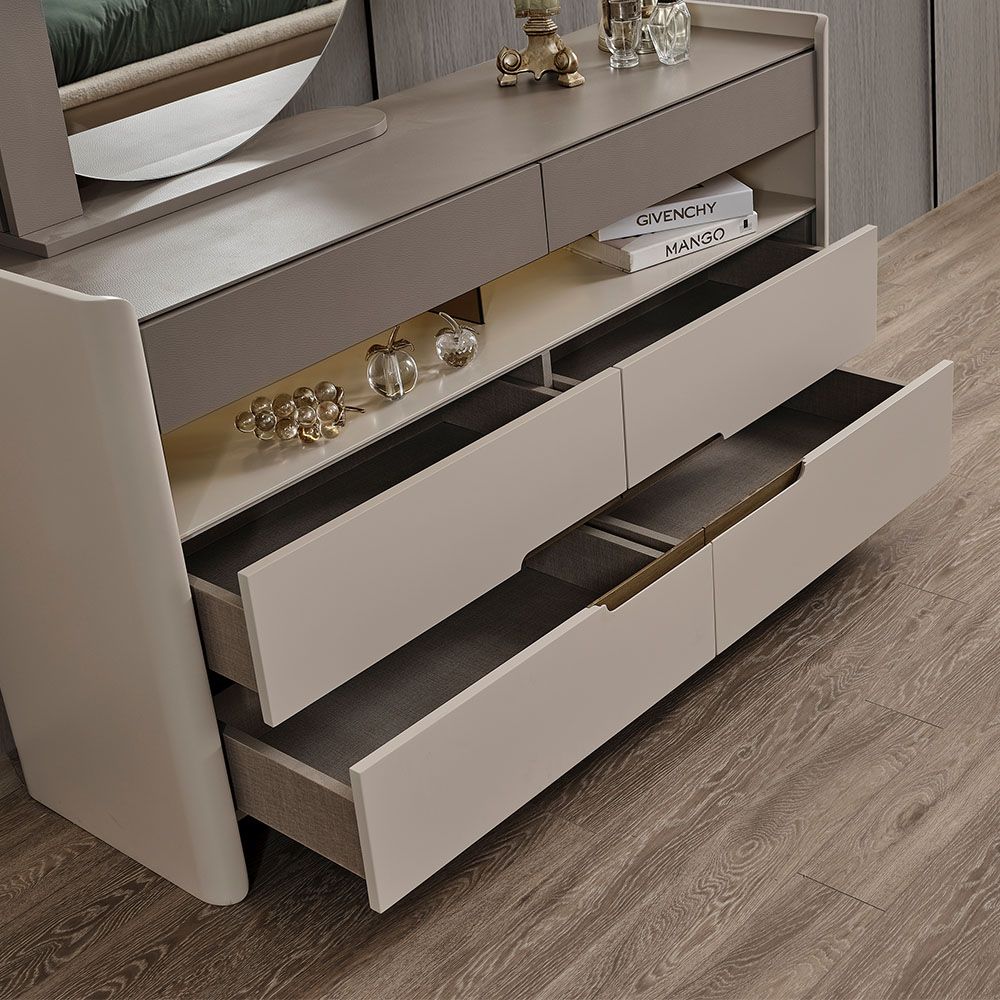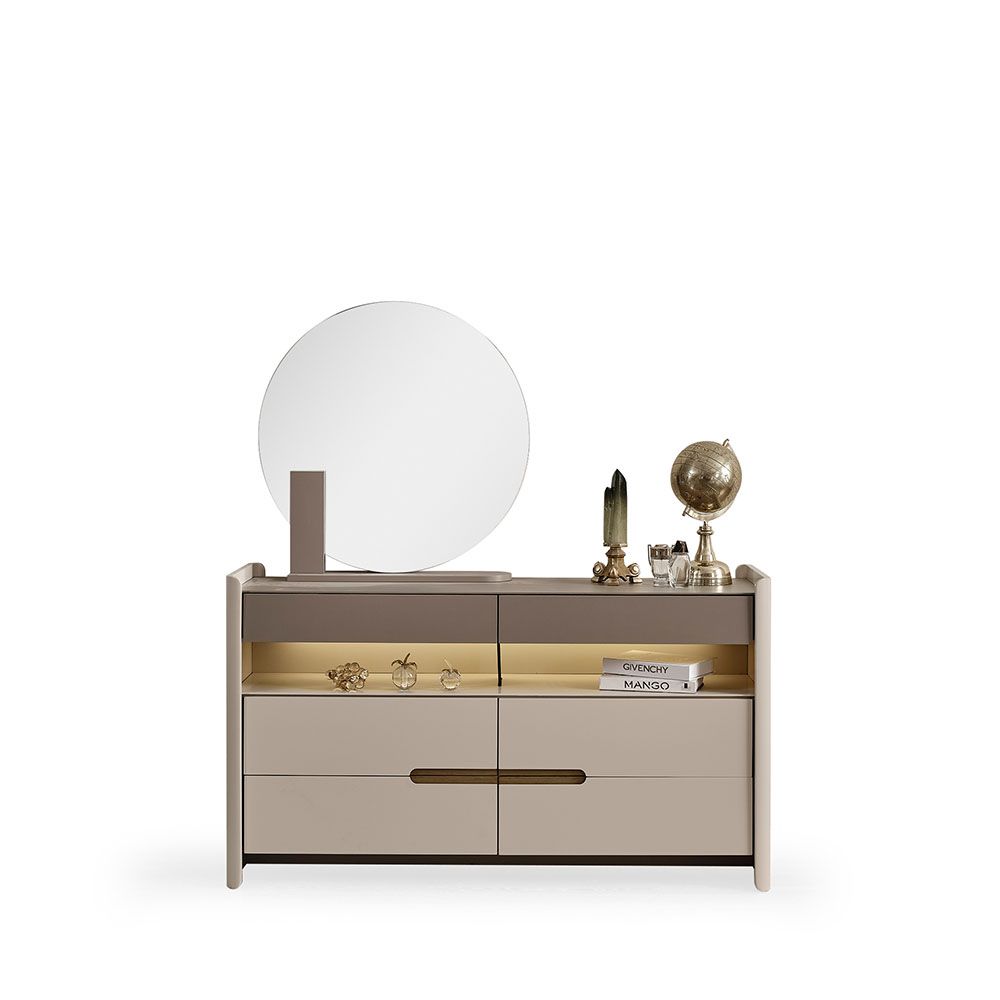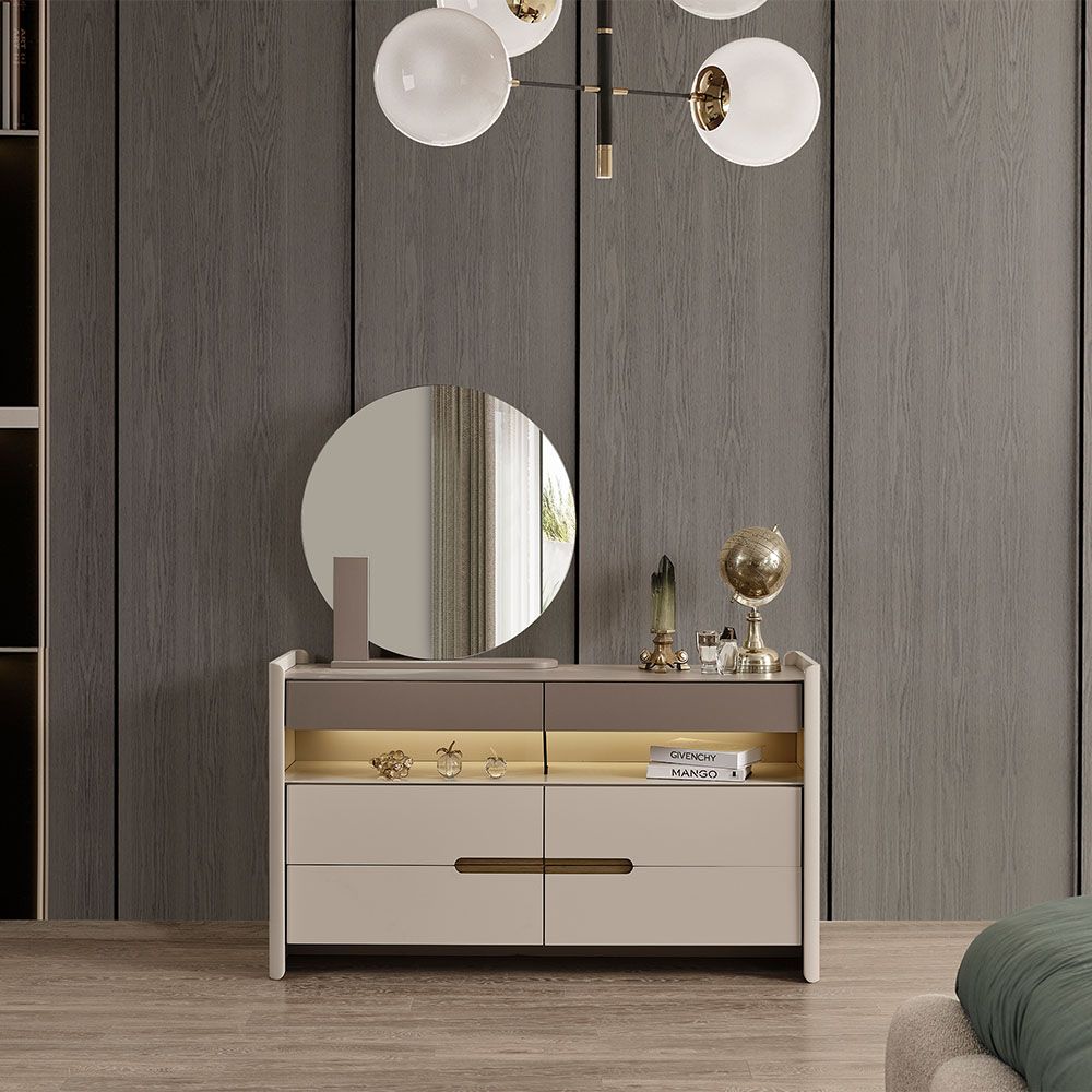 The dresser features six spacious drawers, perfect for organizing your clothes, accessories, and other essentials. The sleek round mirror integrated with the dresser enhances the overall design and adds a touch of sophistication to your room. Additionally, the LED lights add to the aesthetic appeal of the ensemble.