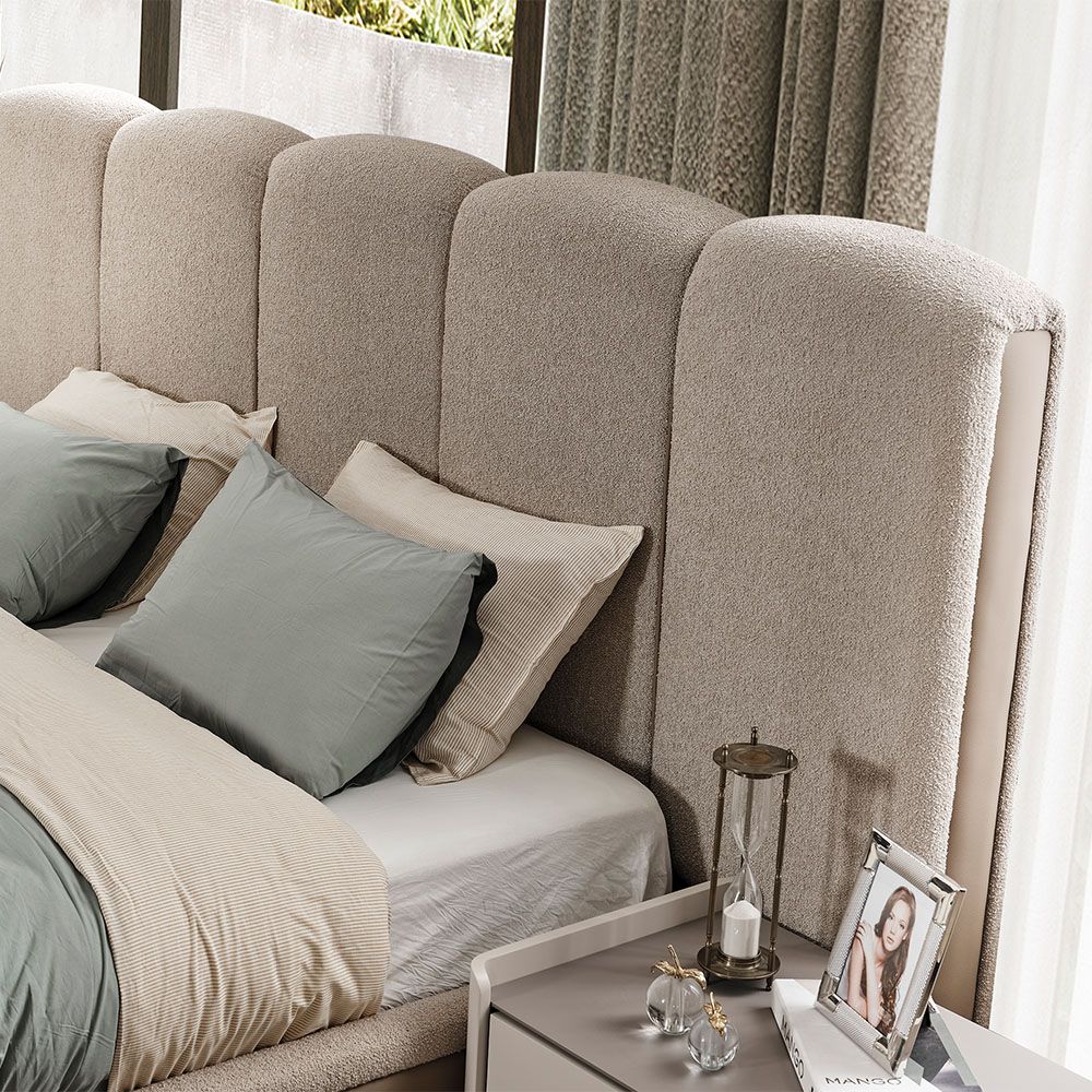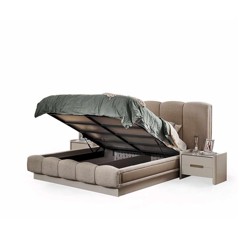 The bed features a high headboard and fabric upholstery. The hydraulic under-bed storage offers ample space for stacking away extra bedding and other belongings.