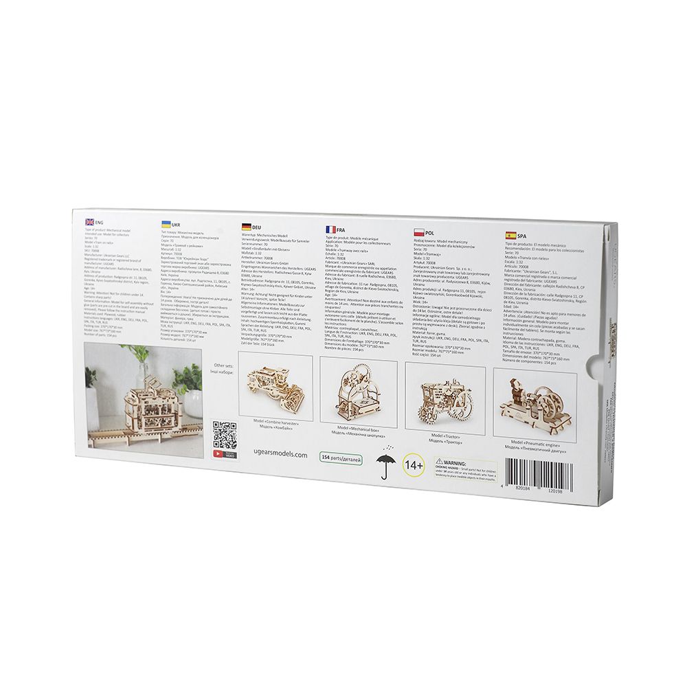 Bring engineering and nostalgia together with the Ugears, Made in Europe, 3D Wooden Puzzle Tram with Rails. This beautifully crafted Mechanical Model Kit with 154 Parts offers an exciting blend of creativity, motion, and learning. It features a self-propelled rubber-band engine that powers the tram along its wooden rails—no batteries or electricity required.