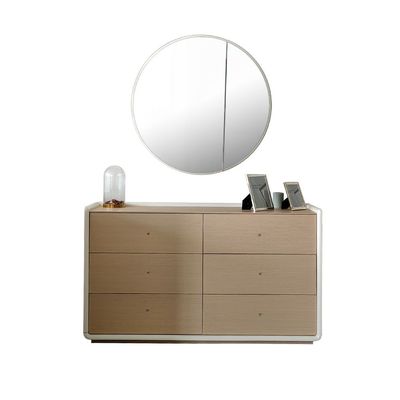 It features six spacious drawers, perfect for organizing clothes, accessories, or other essentials, while a round mirror adds a touch of sophistication and enhances the dresser’s functionality.