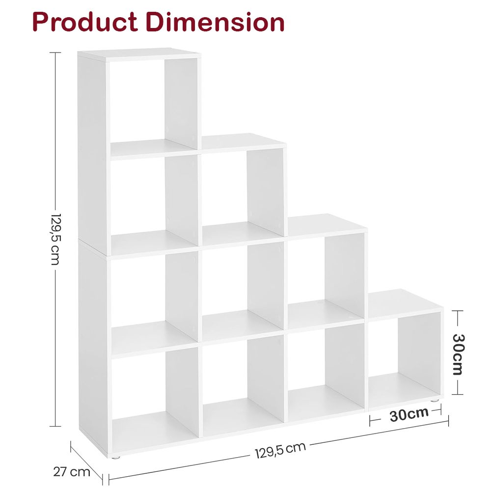 VASAGLE 10 Cube Wooden Storage Unit with Staircase Design - Freestanding Bookcase, Display Shelf, and Organizer for Living Room, Bedroom, or Study - White