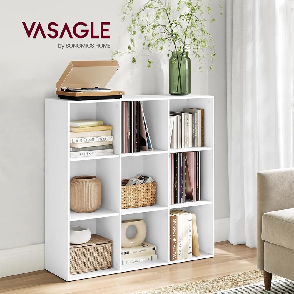 Modern 9 Compartment Bookcase Design - This VASAGLE open shelf bookcase features 9 spacious storage cubes, making it ideal for organizing books, magazines, photo frames, plants, and decorative items in a clean and modern style.