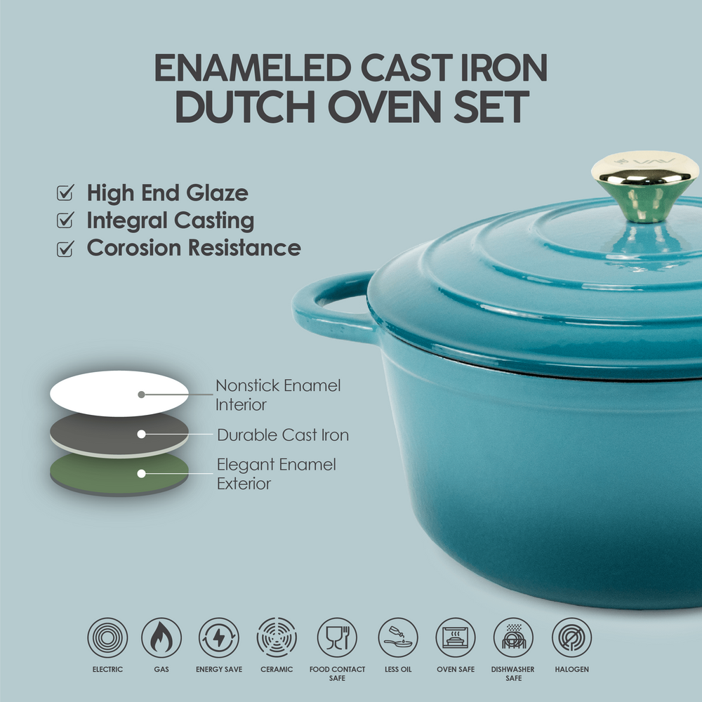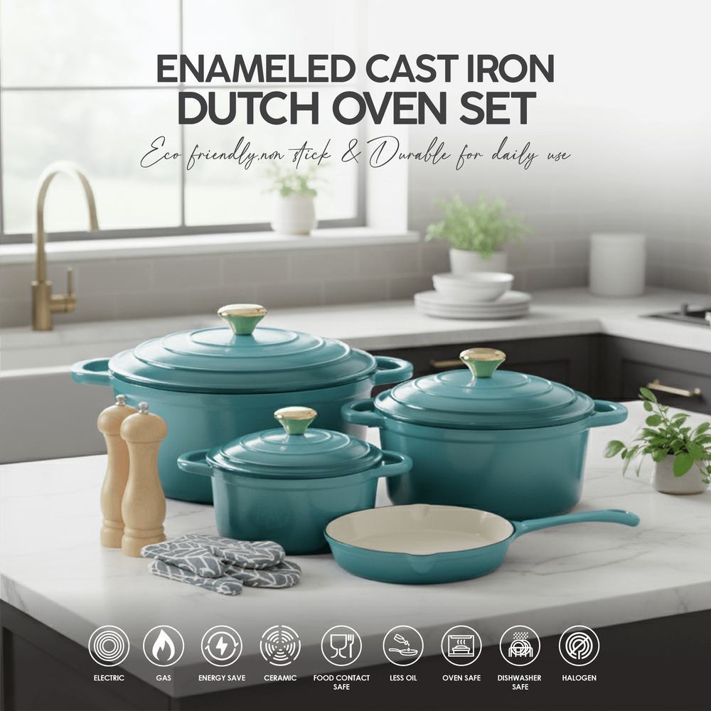 The VAV GET 7-Piece Cast Iron Dutch Oven Cookware Set is designed for superior heat retention, making it perfect for slow cooking, tenderizing vegetables, and preparing rich meat stews. Its even heat distribution also makes it ideal for baking no-knead bread. This enameled, non-stick set is compatible with gas, ceramic, electric, and induction cooktops. Complete with durable lids, protective gloves, and 2-piece mills, it’s a healthy, versatile, and essential addition to every kitchen.