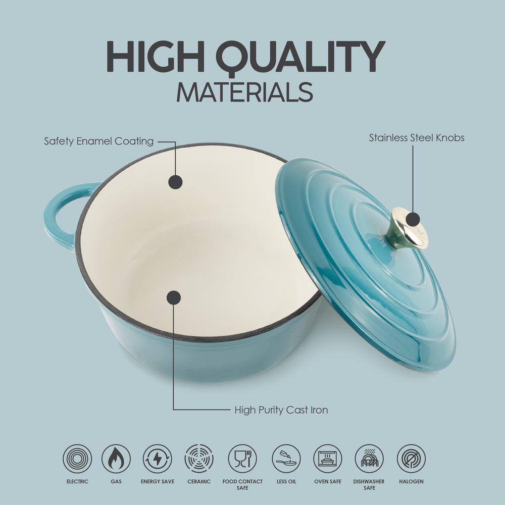Healthy And Safe Non-Stick Enameled Cast Iron 7-Piece Dutch Oven Cookware Set With Gloves And 2-Piece Mills. Includes: 24Cm Dutch Oven Fry Pan, 18Cm, 21Cm, And 24Cm Dutch Ovens With Lids, Gloves, And 2-Piece Mills. - Teal