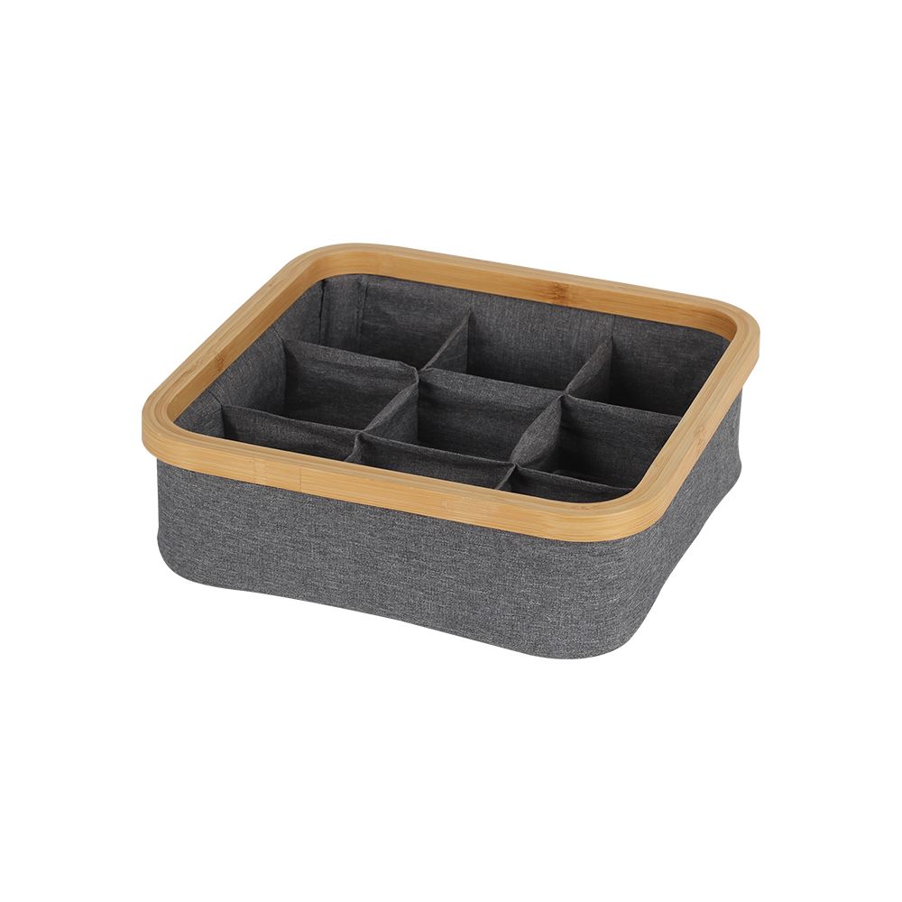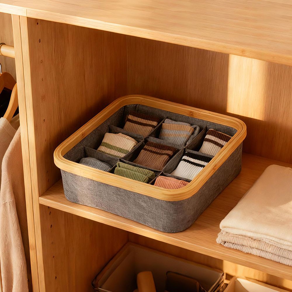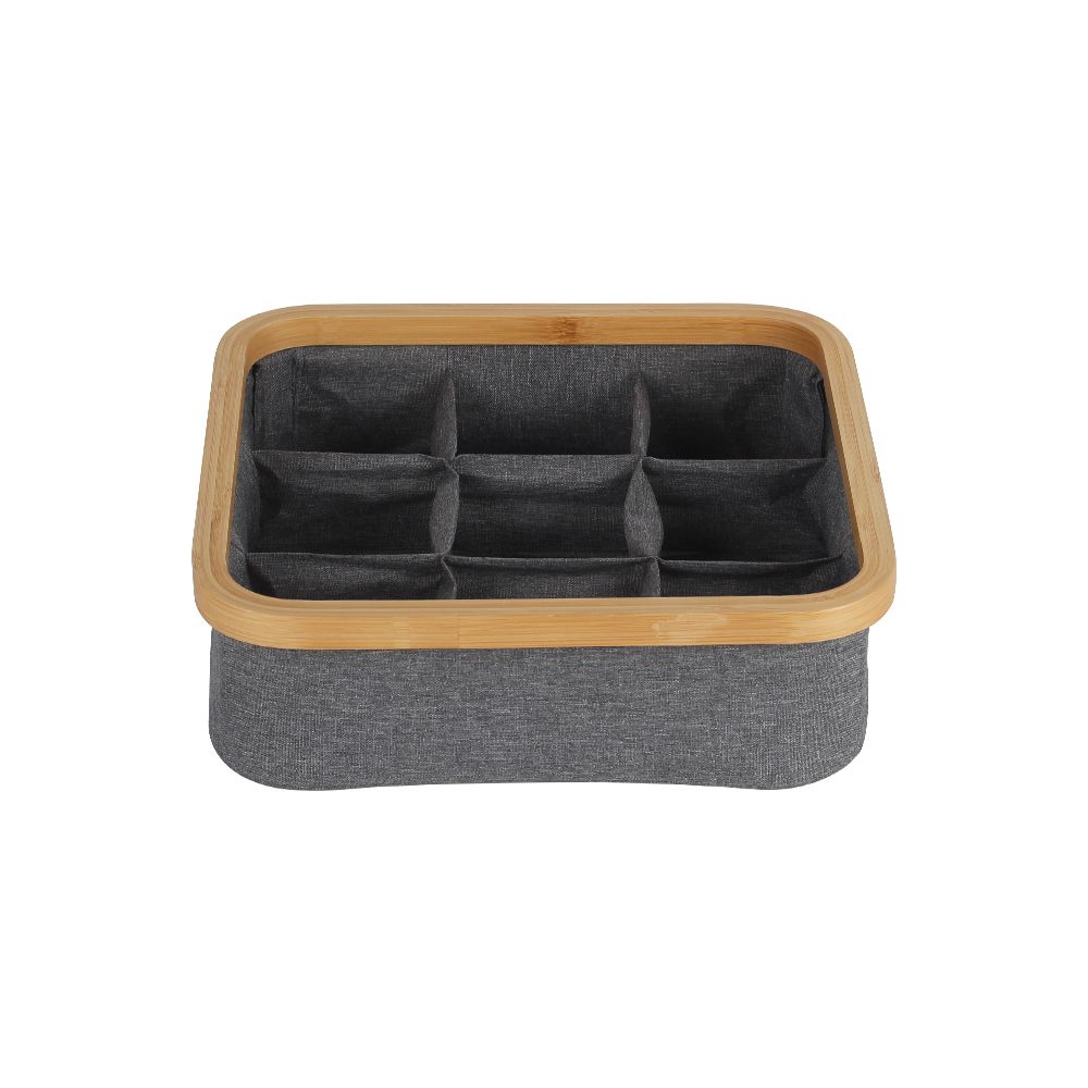 Organize your essentials neatly with this elegant fabric organizer tray featuring a natural bamboo rim. Designed with six compartments, it’s perfect for sorting accessories, undergarments, or office supplies while adding a warm, minimalist touch to your space.