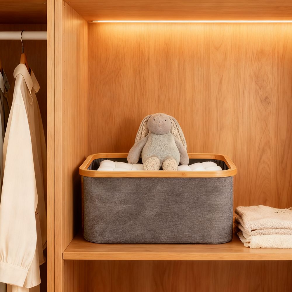 A sleek and modern storage basket designed with a sturdy bamboo rim and durable black fabric body. Ideal for organizing clothes, towels, toys, or daily essentials, it brings a touch of natural elegance to any space while keeping clutter out of sight.