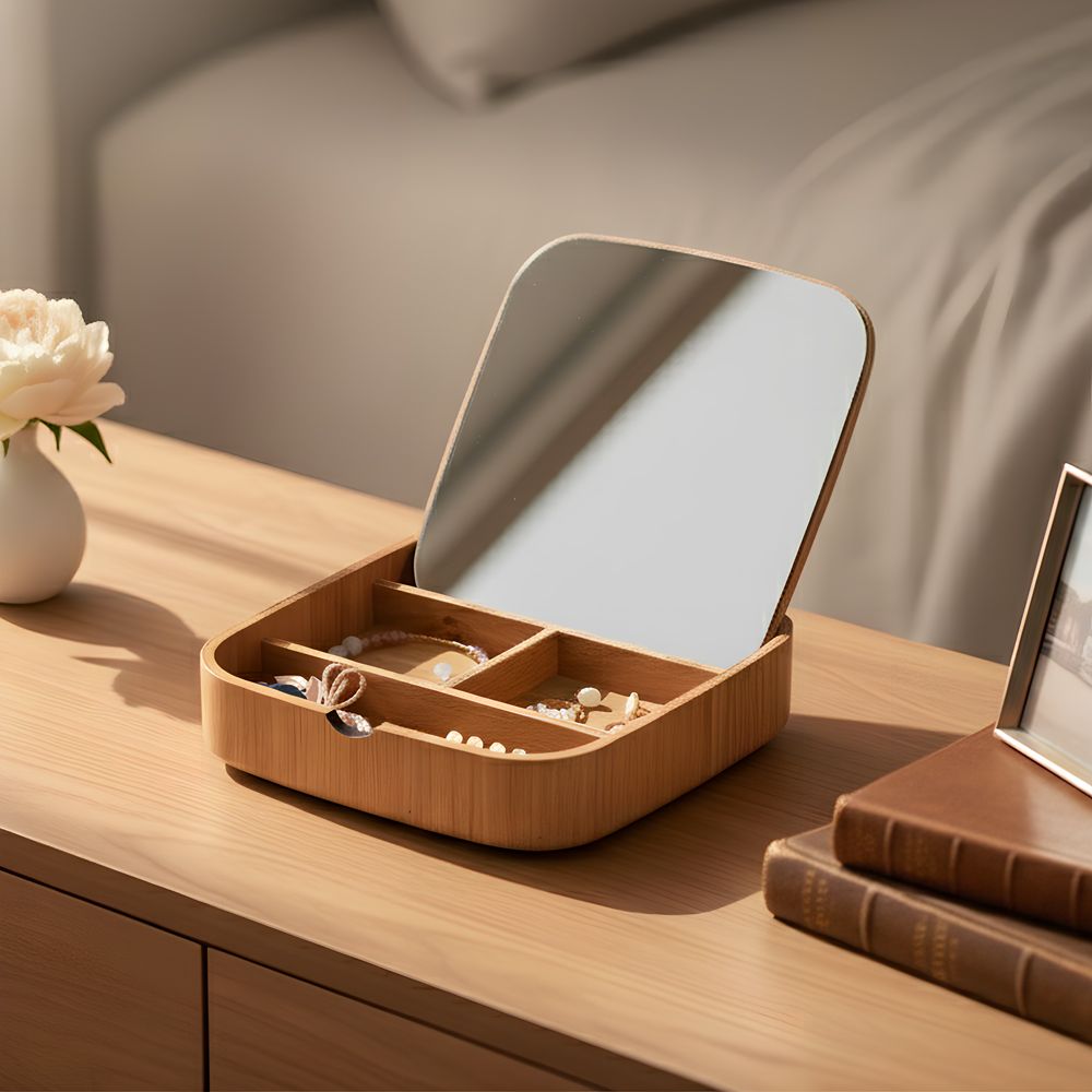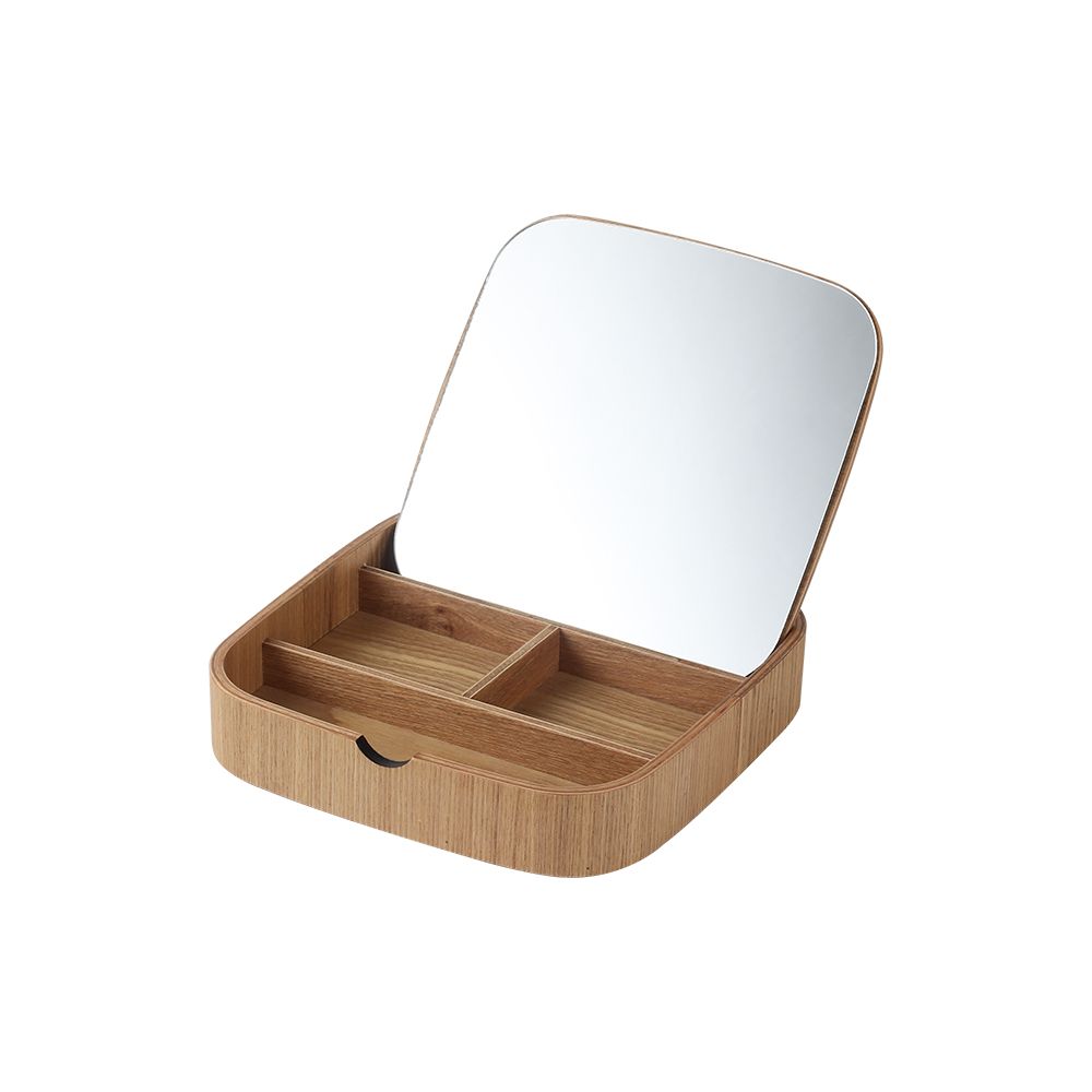 A stylish and functional addition to your dresser or bathroom, this walnut wooden vanity organizer features a built-in mirror and multiple compartments for your daily essentials. Its natural wood finish and compact design make it perfect for keeping jewelry, cosmetics, and accessories neatly organized.