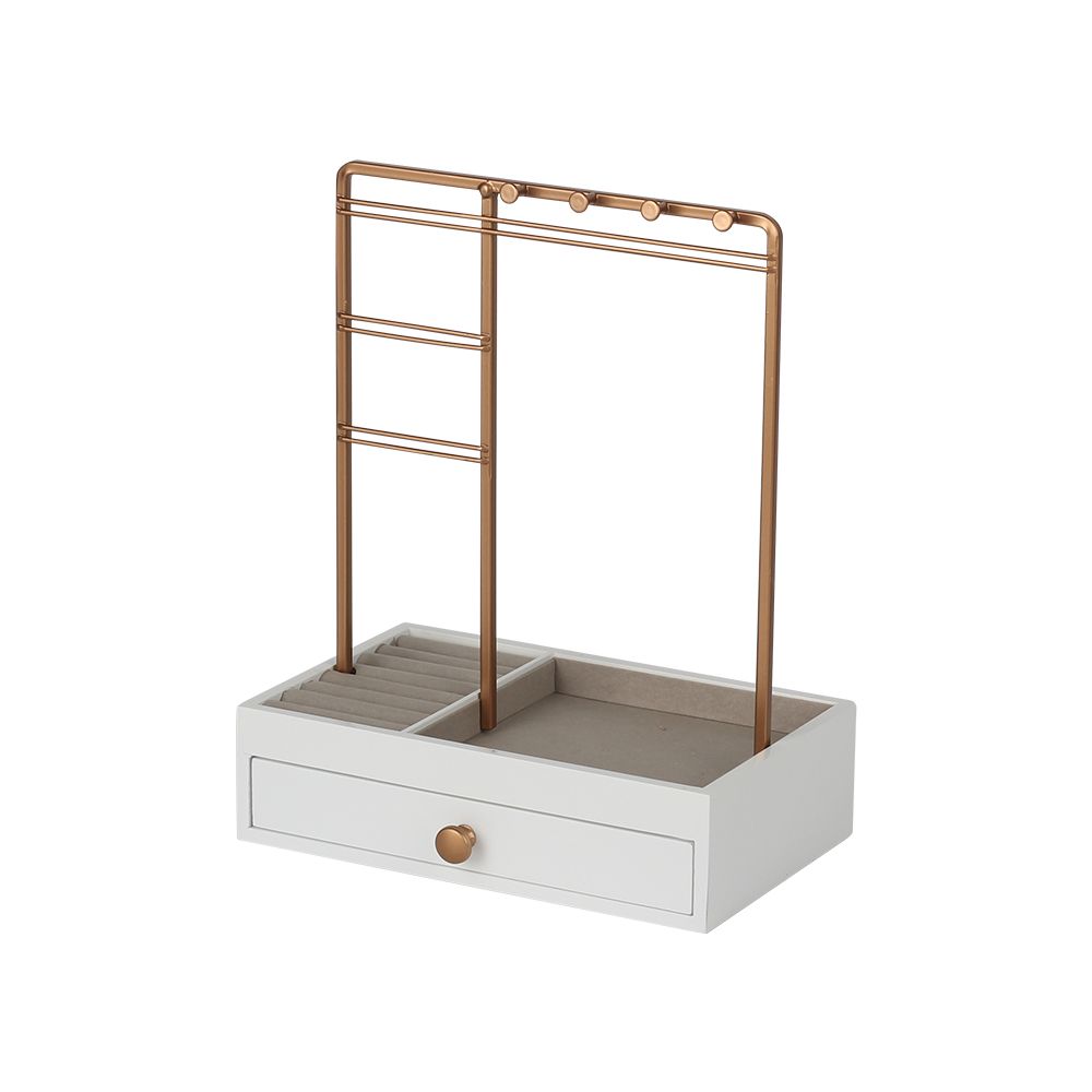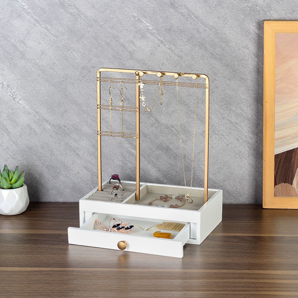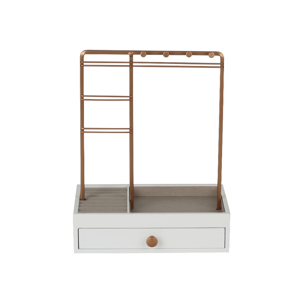 Elegantly display and organize your jewelry with this modern gold and white organizer stand. Designed with multiple hanging bars for necklaces and earrings, cushioned slots for rings, and a spacious drawer for bangles or watches, it offers a perfect blend of functionality and style for your dressing table.