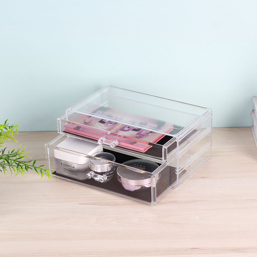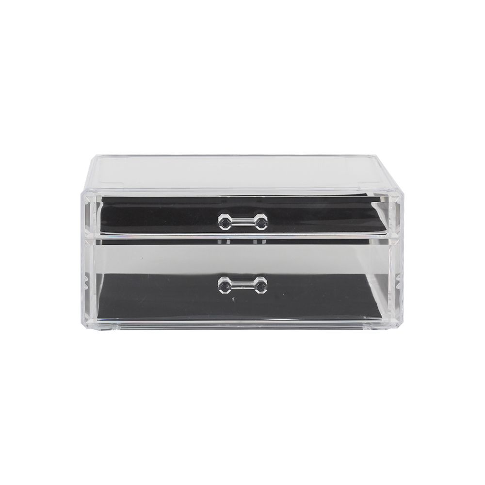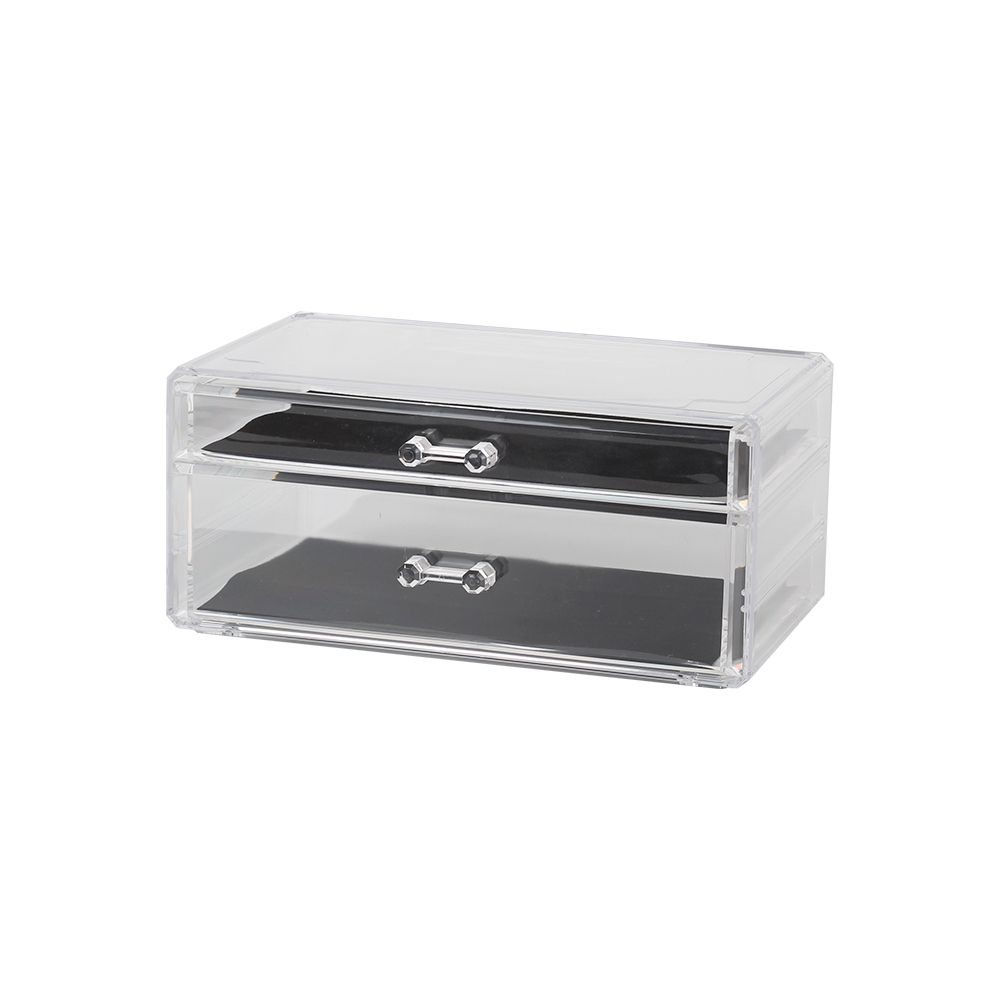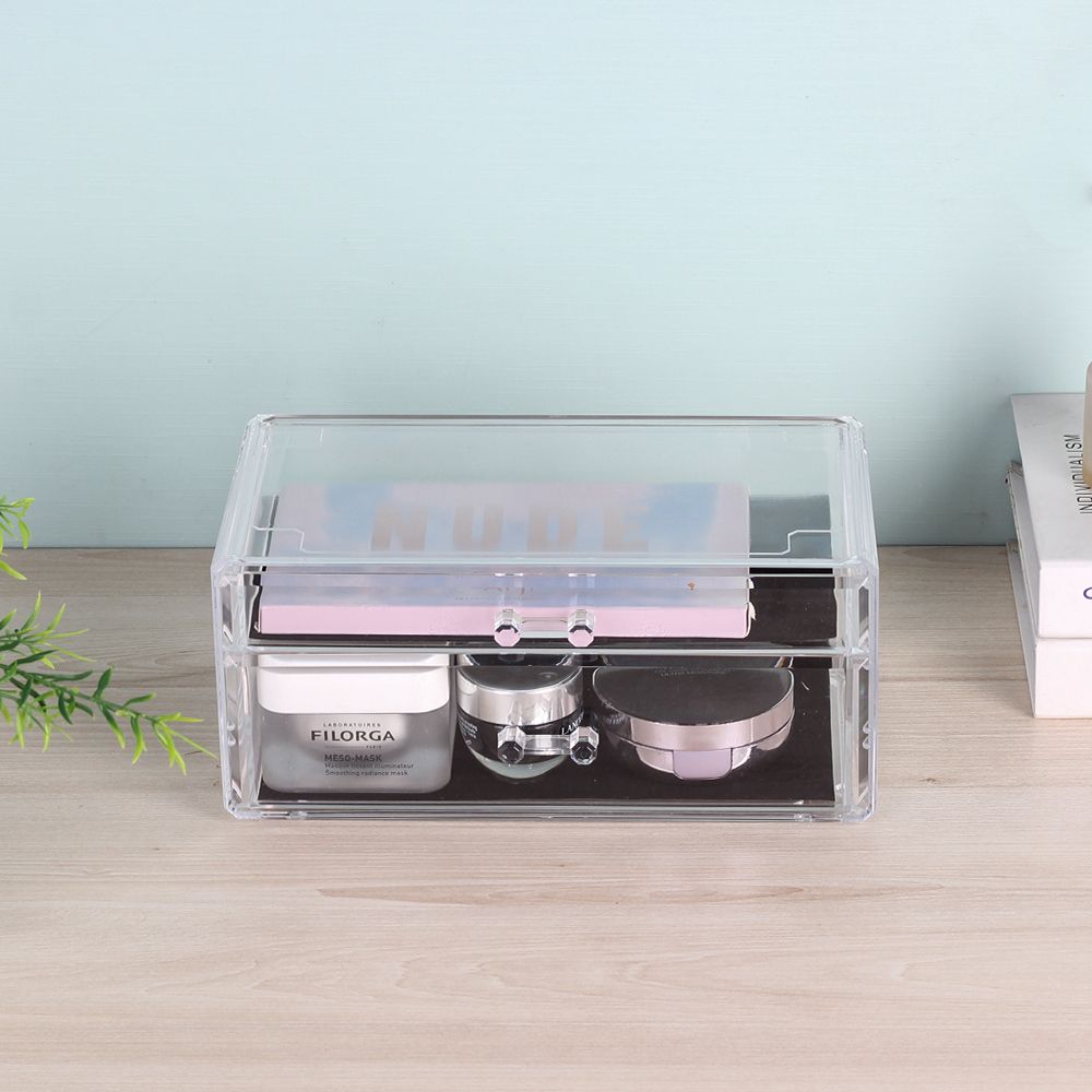 A compact and elegant acrylic makeup organizer designed to keep your beauty essentials tidy and accessible. Featuring two spacious drawers with smooth handles, it’s perfect for storing lipsticks, eyeliners, brushes, and accessories while adding a modern touch to your vanity.