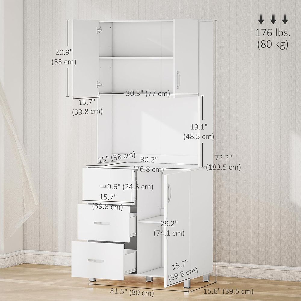 White Kitchen Pantry Hutch – Freestanding Cabinet with Drawer Storage & Microwave Nook