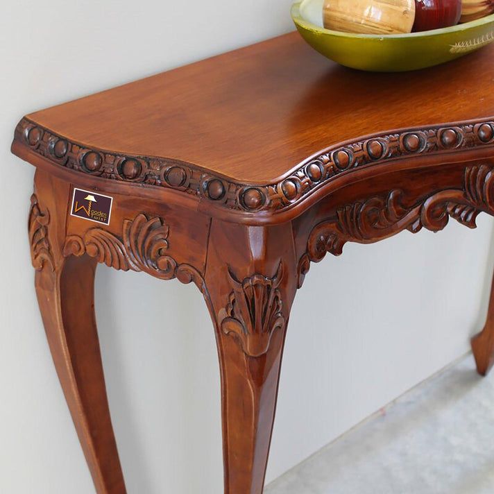 Hand-Carved Teak Wood Royal Console Table Elegant Leaf Design ( Brown )