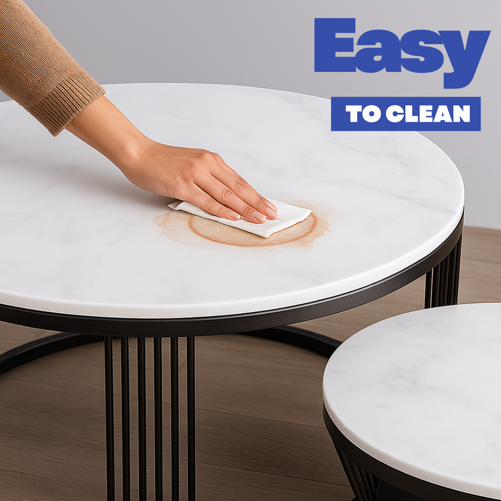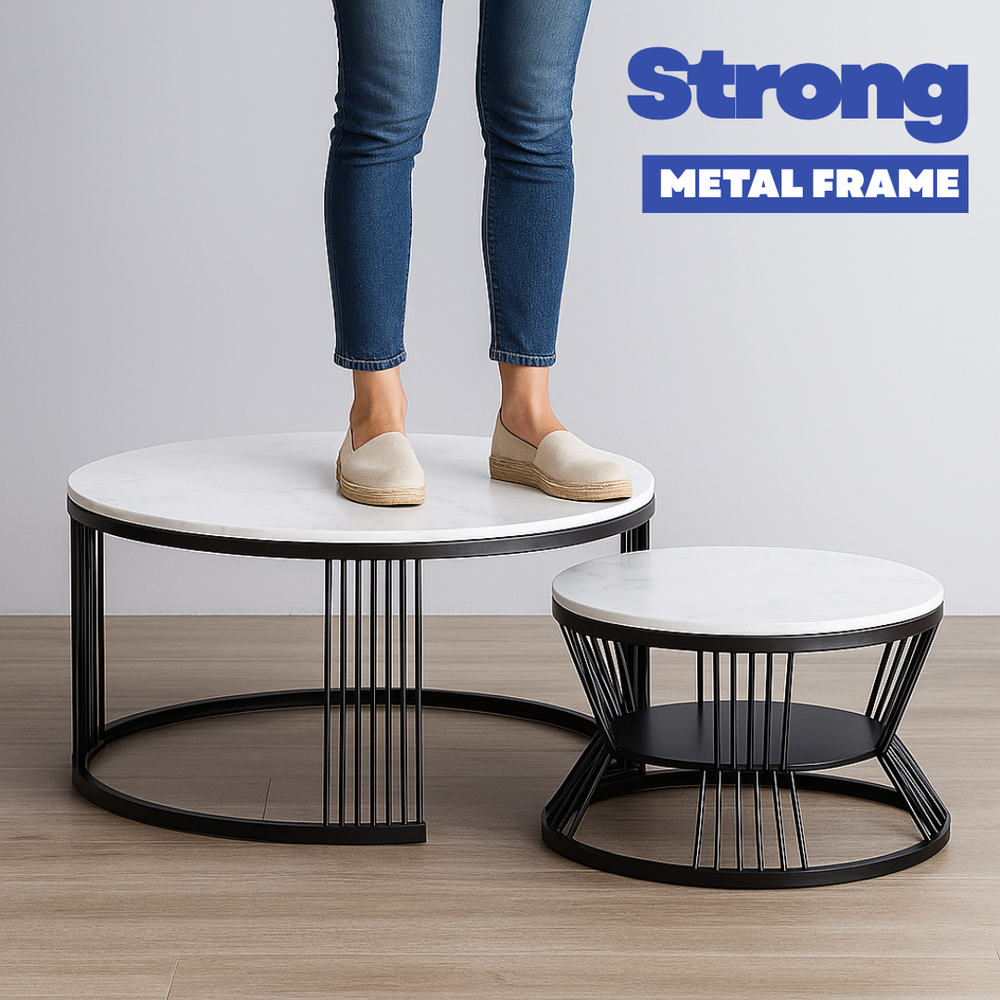 Marvello Duo Round Marble Top Coffee Table Set with Black Iron Frame – Modern Luxury Nesting Design for Living Room Décor