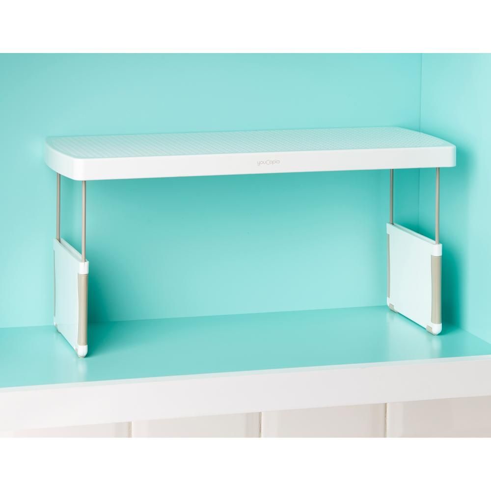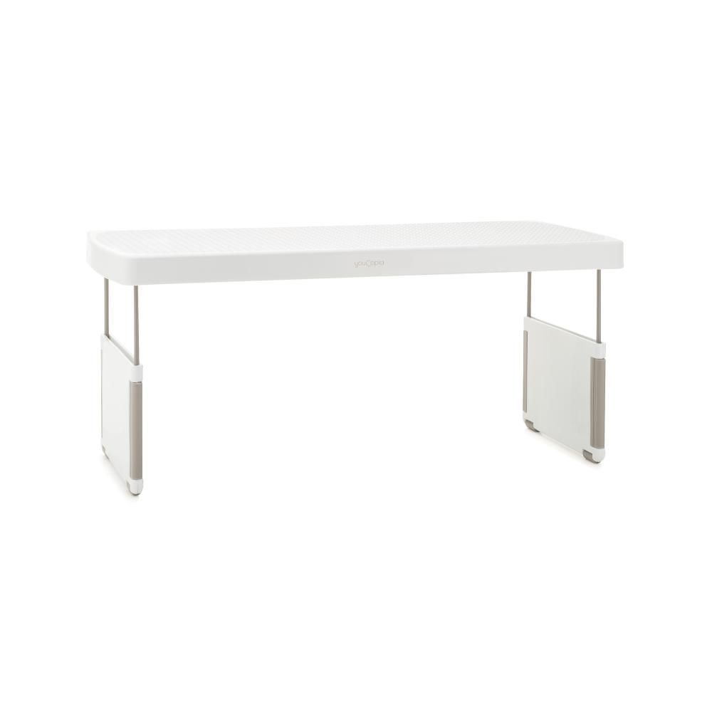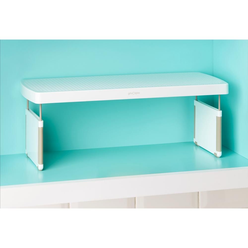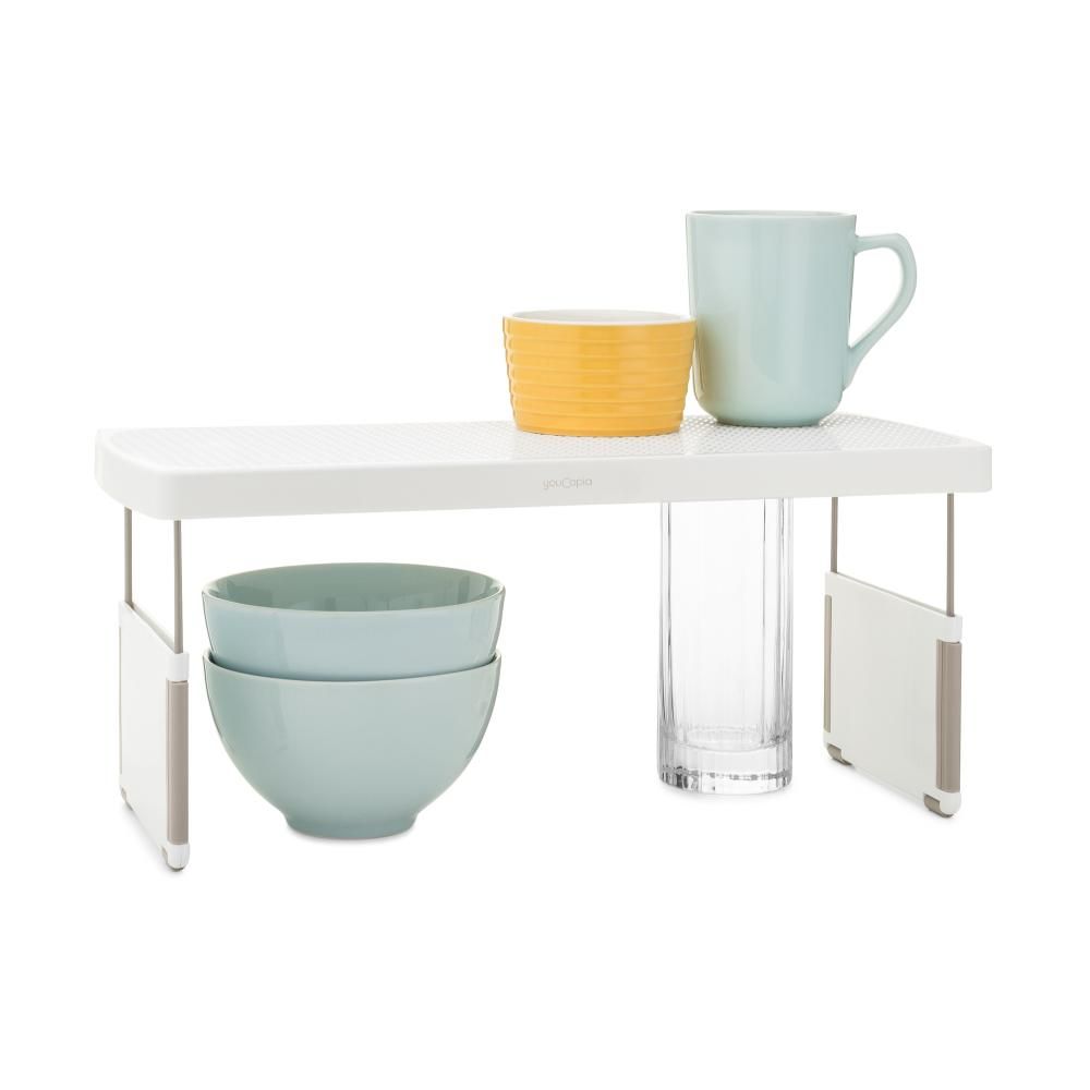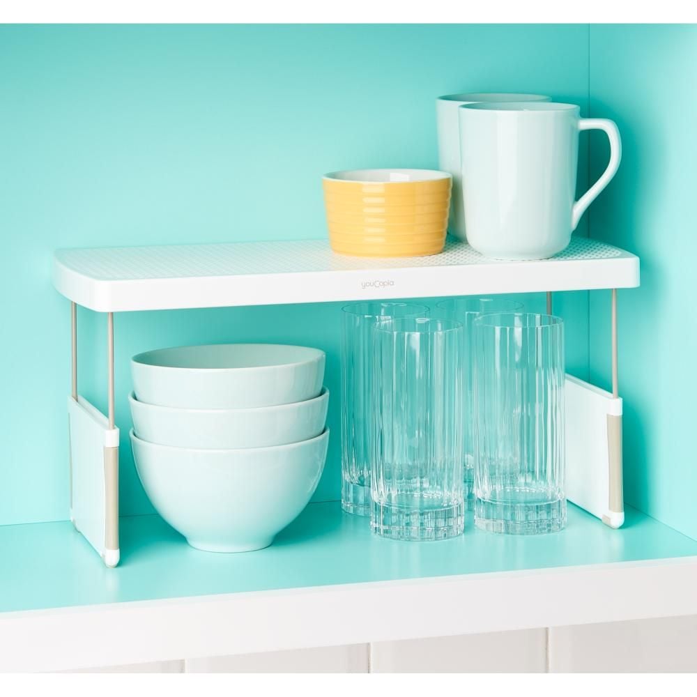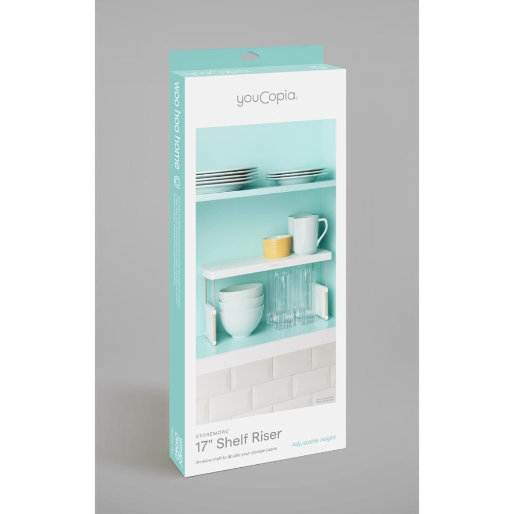YouCopia StoreMore Expandable Kitchen Cabinet Shelf Organizer, Adjustable 17 Inch Storage Rack for Cups Glasses Bottles, Durable and Space-Saving, White- 50090