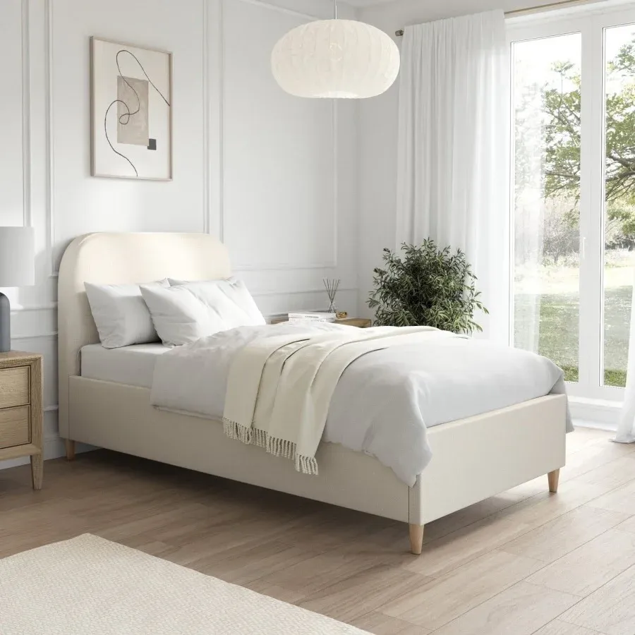 This modern bed combines simplicity and comfort in one contemporary design. Featuring a thick padded headboard upholstered in durable, soft-to-touch cream fabric and stylish tapered legs. Built with a sturdy wooden frame and a sprung-slatted base supported by central legs, this bed ensures long-lasting durability and stability.